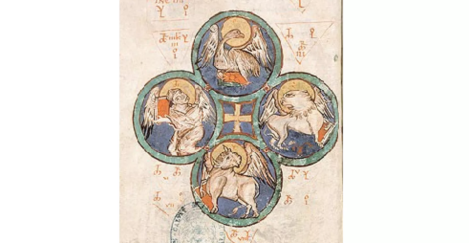Fol. 25 v°. Miniature représentant les symboles des quatre évangélistes dans quatre médaillons accolés avec une croix dorée au milieu et inscriptions tachygraphiques.