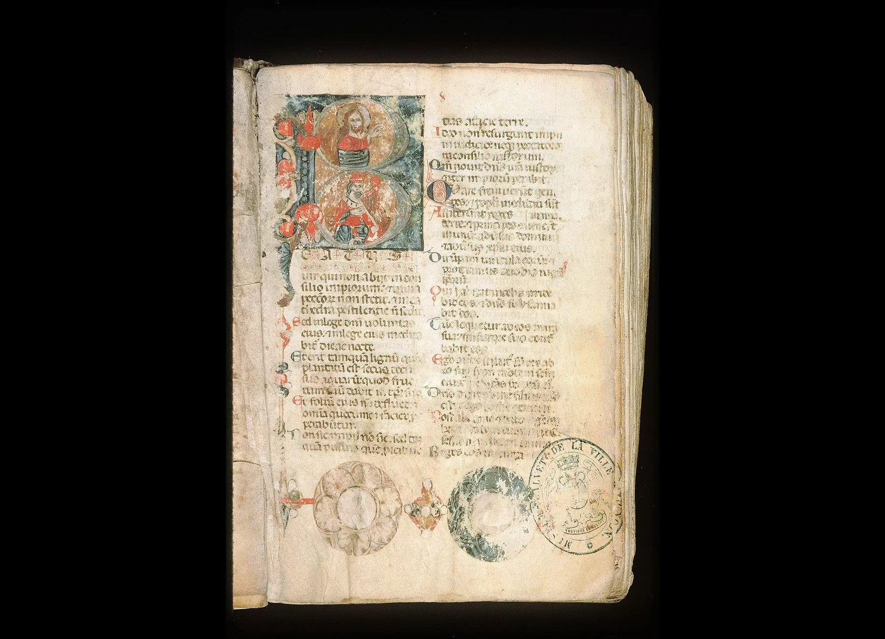 Commentaires de Labande. Fin du XVIe siècle. Parchemin. 125 feuillets. 672 sur 500 millim. Les principales initiales de couleurs très variées, avec ornements estampés ou bien avec scènes dessinées assez grossièrement. Depuis le fol. 94, les lettres sont estampées. Demi-rel. basane. (Eglise de la Major d'Arles - Acquis le 22 juillet 1873.)