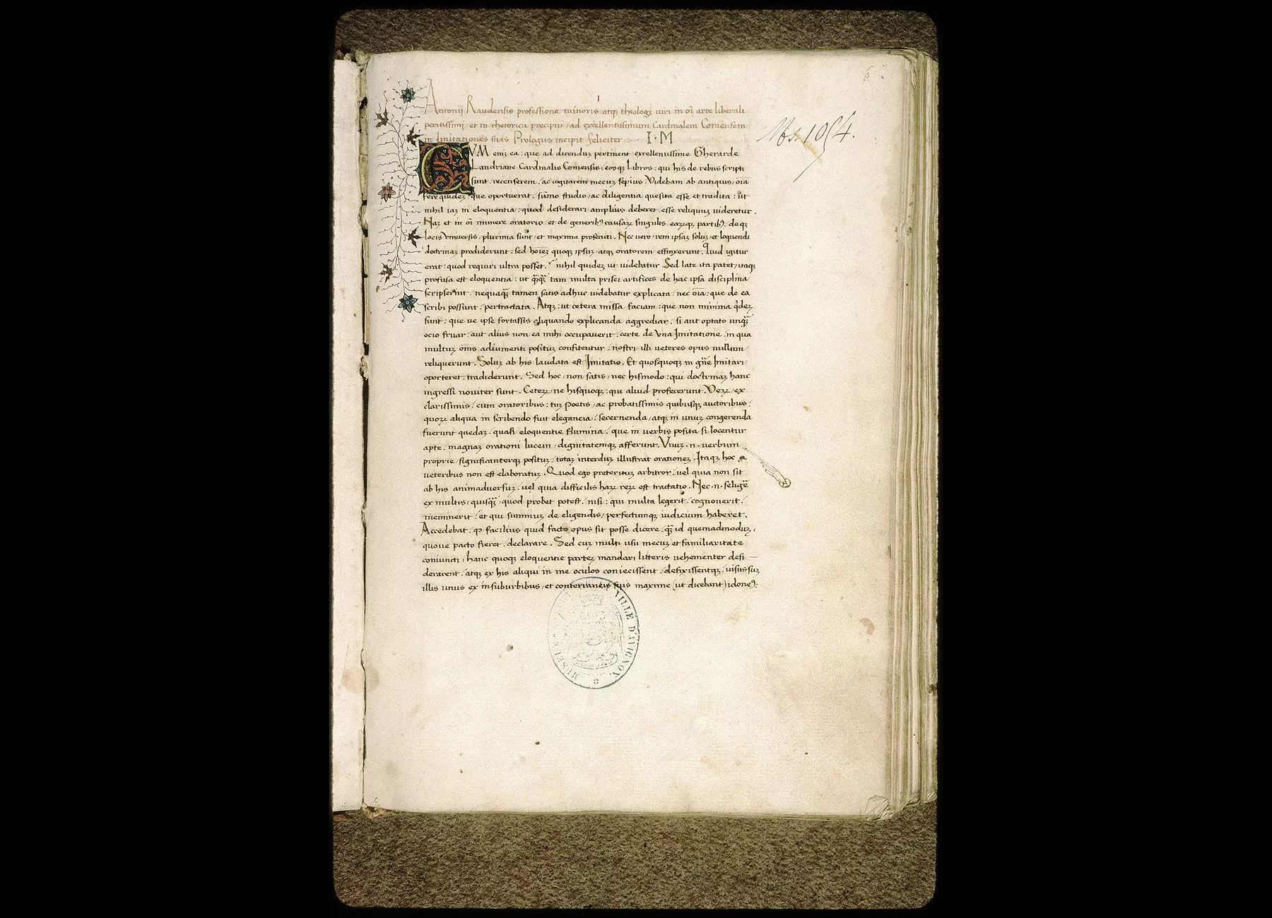 Fol. 1. " Antonii Raudensis, professione Minoris atque theologi viri, in omni arte liberali peritissimi et in rhetorica precipui, ad excellentissimum cardinalem Comensem, in Imitationes suas prologus incipit feliciter. Cum enim ea que ad dicendum pertinent, excellentissime Gherarde Landriane, cardinalis Comensis, eosque libros qui his de rebus... "