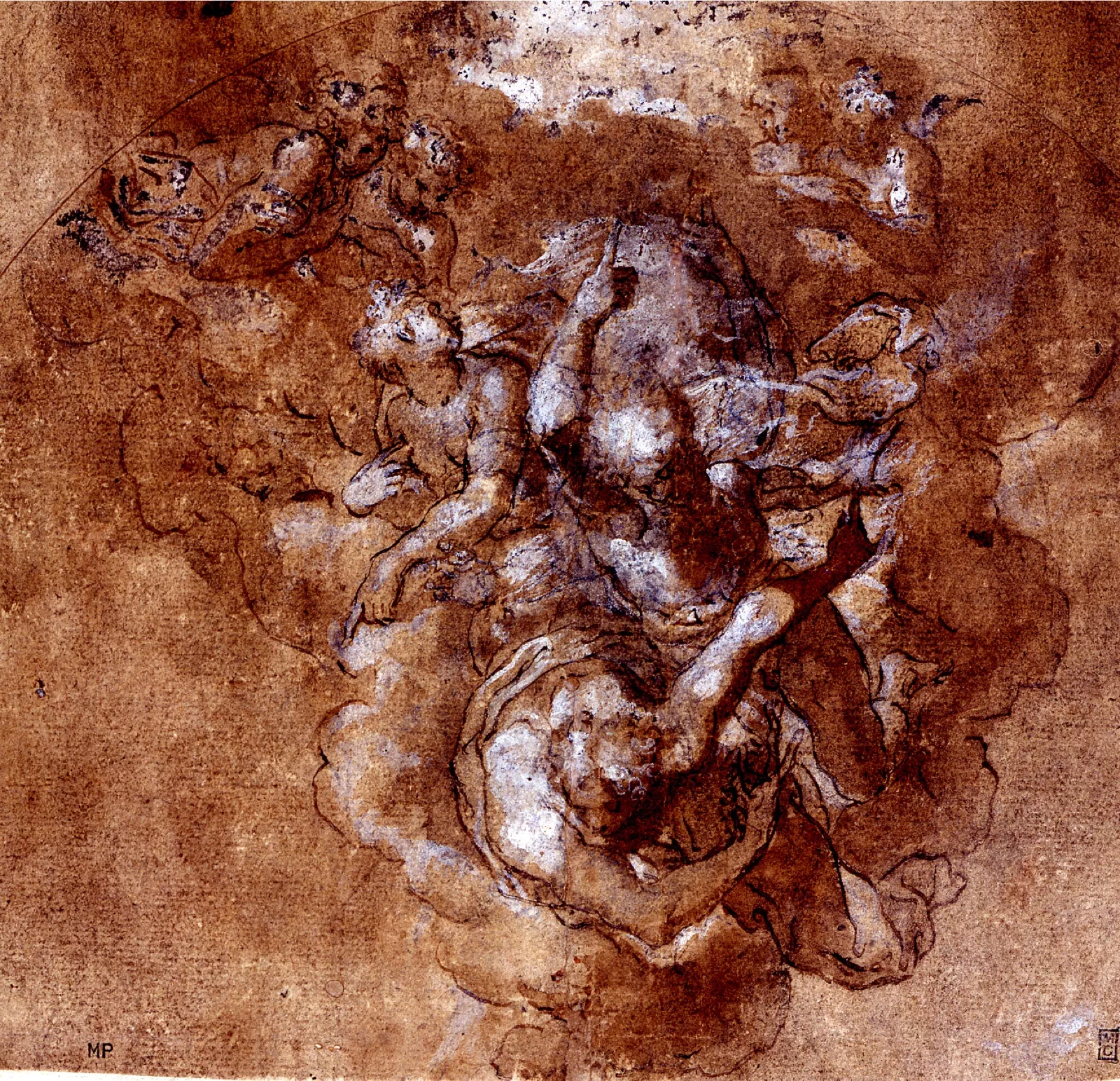 Encre, lavis bruns, rehauts de blanc
