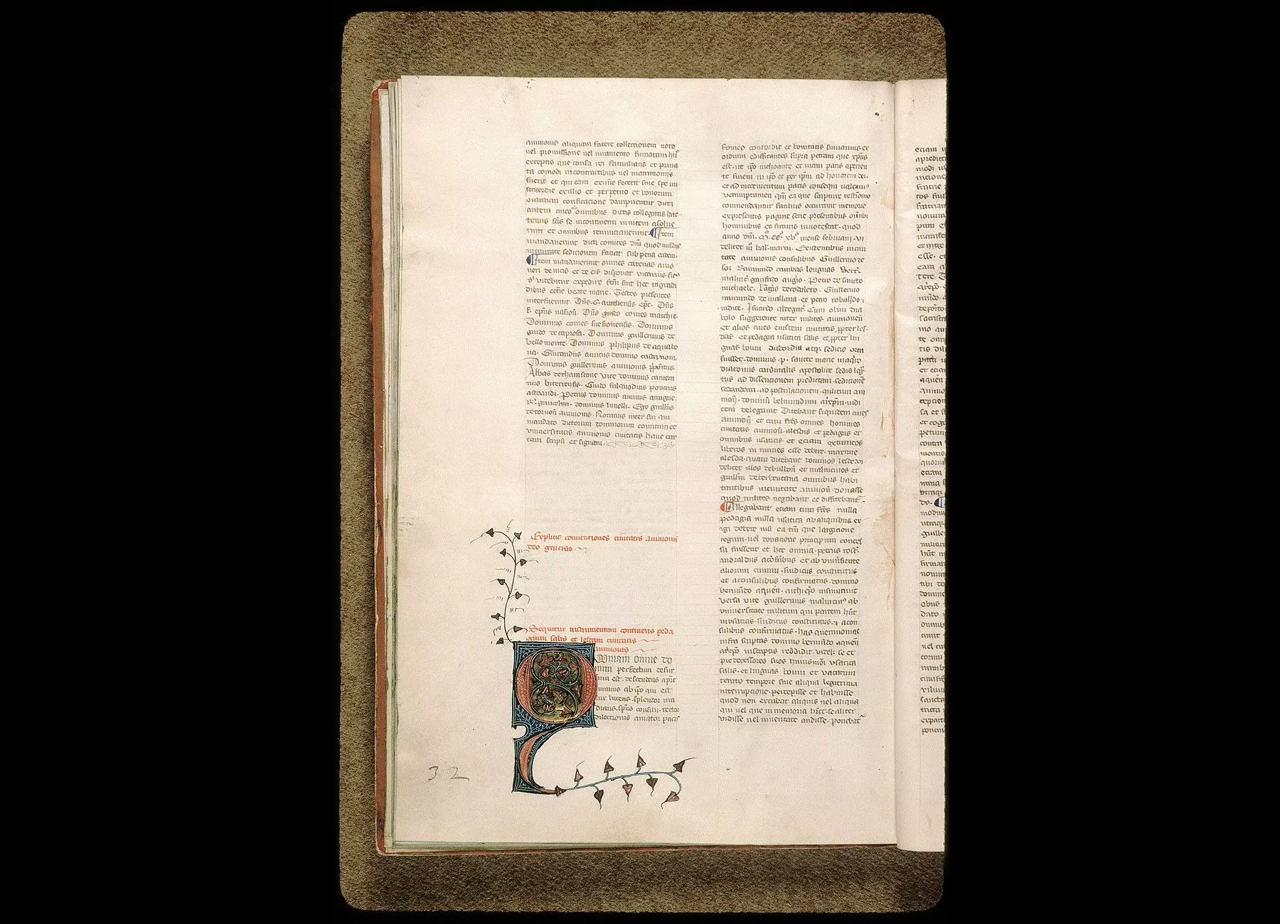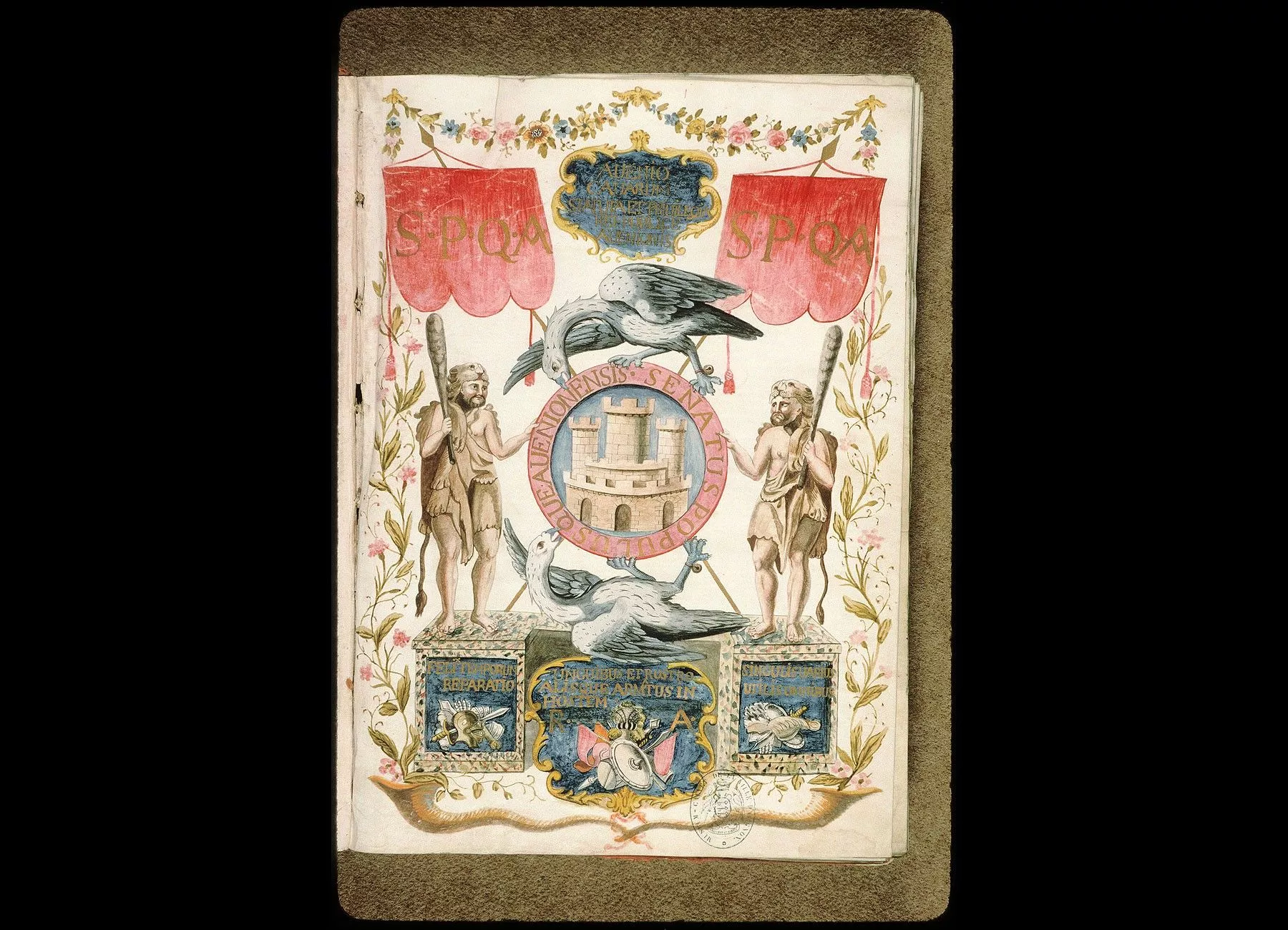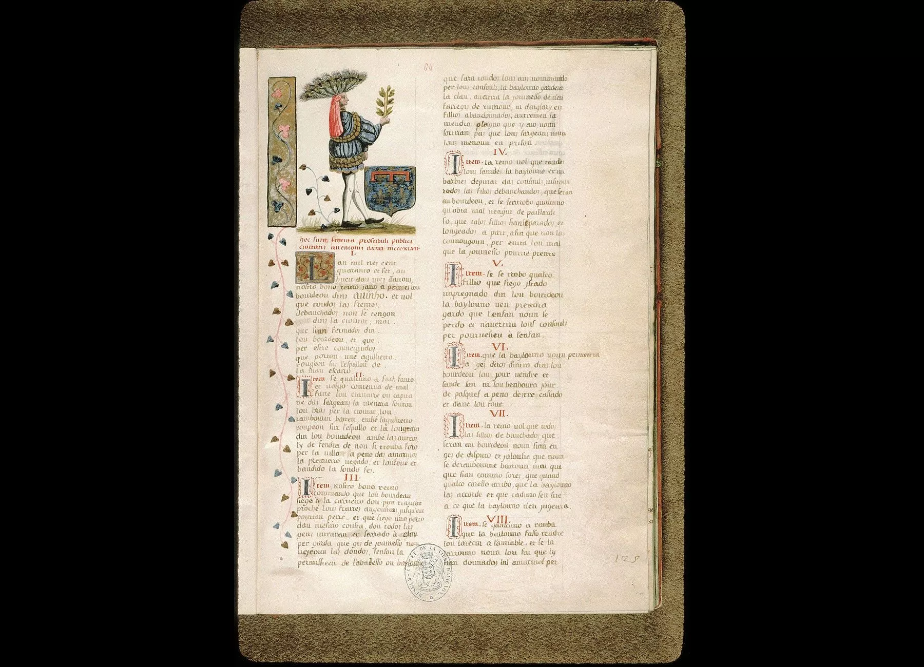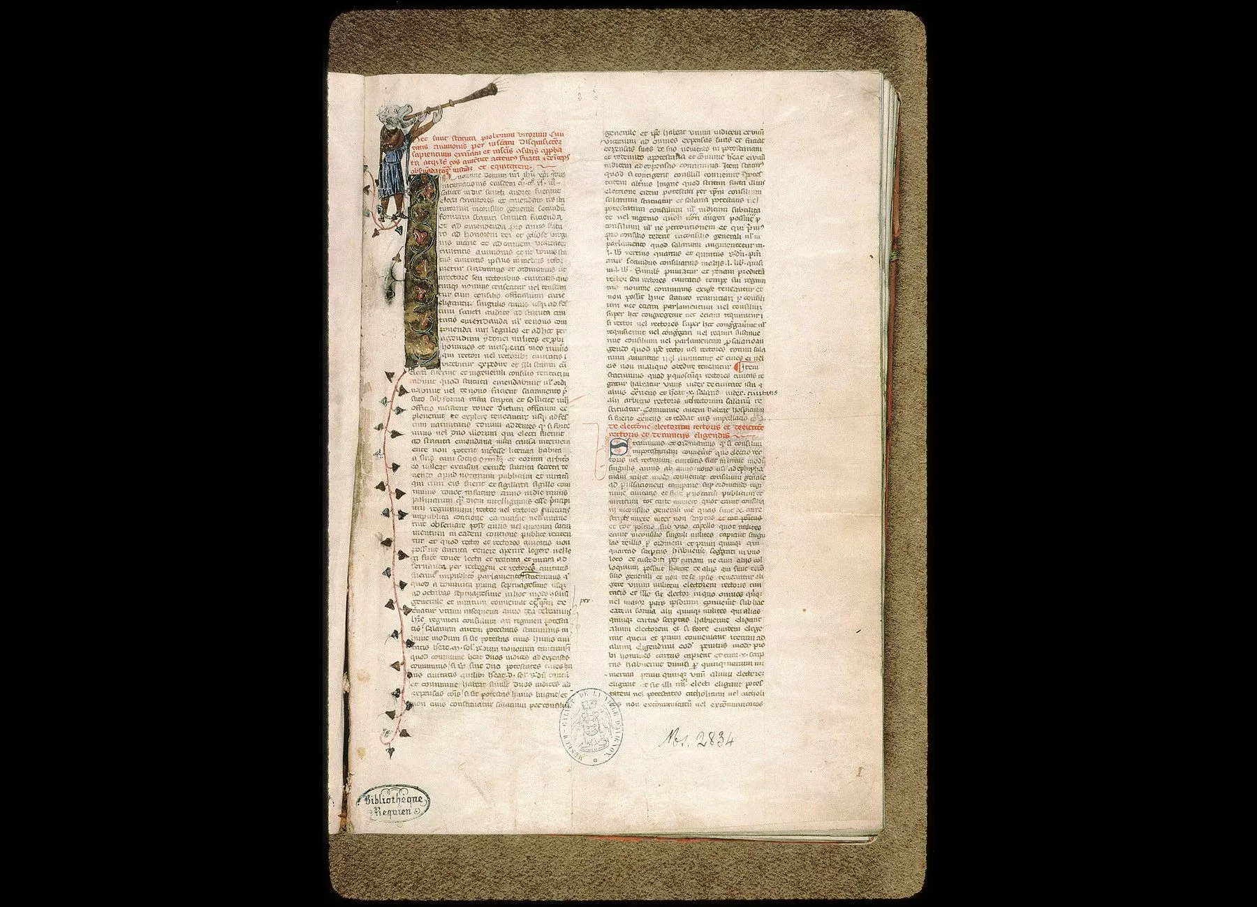 Commentaires de Labande. XIVe-XVIe siècle. Parchemin. 97 feuillets. 444 sur 312 millim. Frontispice décoré au début du XIIIe siècle, où l'on remarque les anciennes armoiries de la commune d'Avignon, soutenues par deuxgerfauts et par deux figures d'Hercule. Quelques initiales miniaturées.Demi-rel. maroquin; les plats sont recouverts d'une étoffe de soie. (Bibliothèque Requien.)