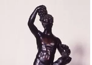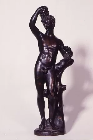 Trous sous la grappe, au sommet de la tête et sous la base. Un jeune homme nu à la chevelure bouclée brandit de la main droite une grappe de raisins. Son avant-bras gauche est appuyé à un gros tronc d'arbre. De la main gauche, il tient une coupe.