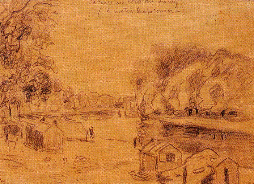 Sisley mentionne: "Le matin, temps couvert" ; La mention inscrite par I'artiste sur l'état de la lumière, destinée le moment venu à rafraichir sa mémoire.
