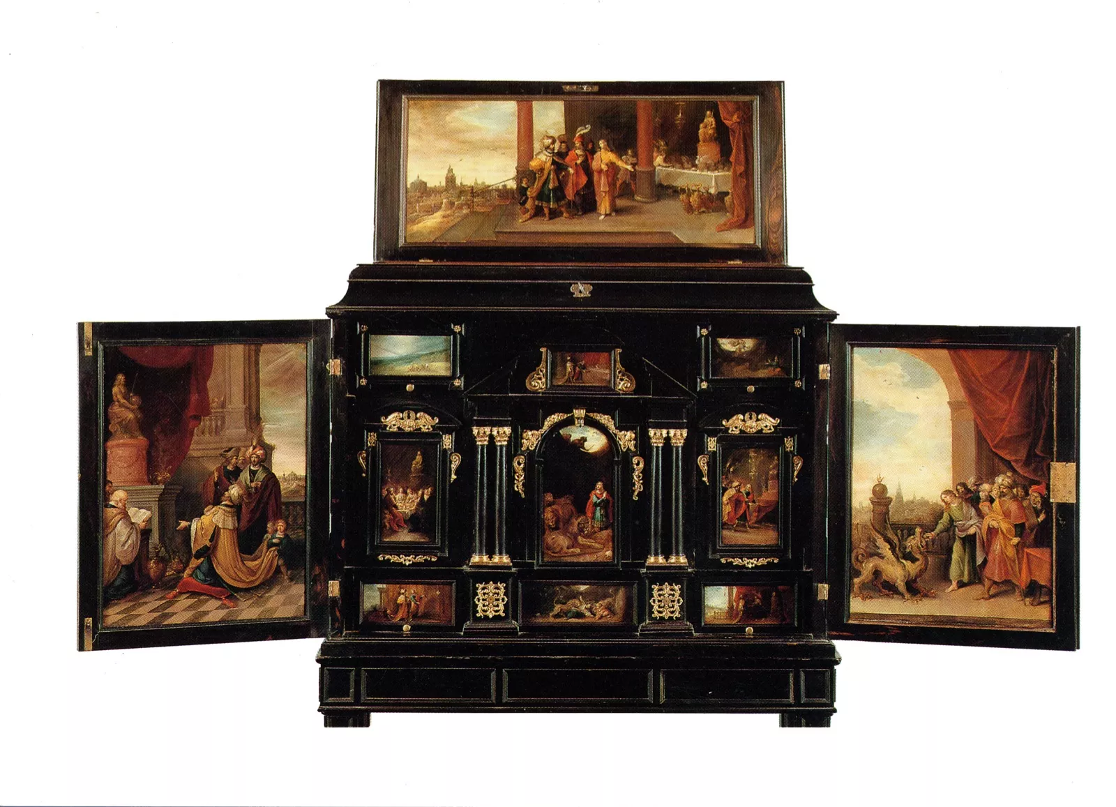 Ce cabinet à peintures, « trésoir » ou Kunstkammer, composé de douze panneaux illustrant un passage de la Bible, raconte plusieurs moments de la vie du prophète Daniel, successivement aux prises avec le roi perse Cyrus, les prêtres du dieu Bel (ou Baal) et le dragon vénéré à Babylone, qu’il tue en l’étouffant avec des boulettes.