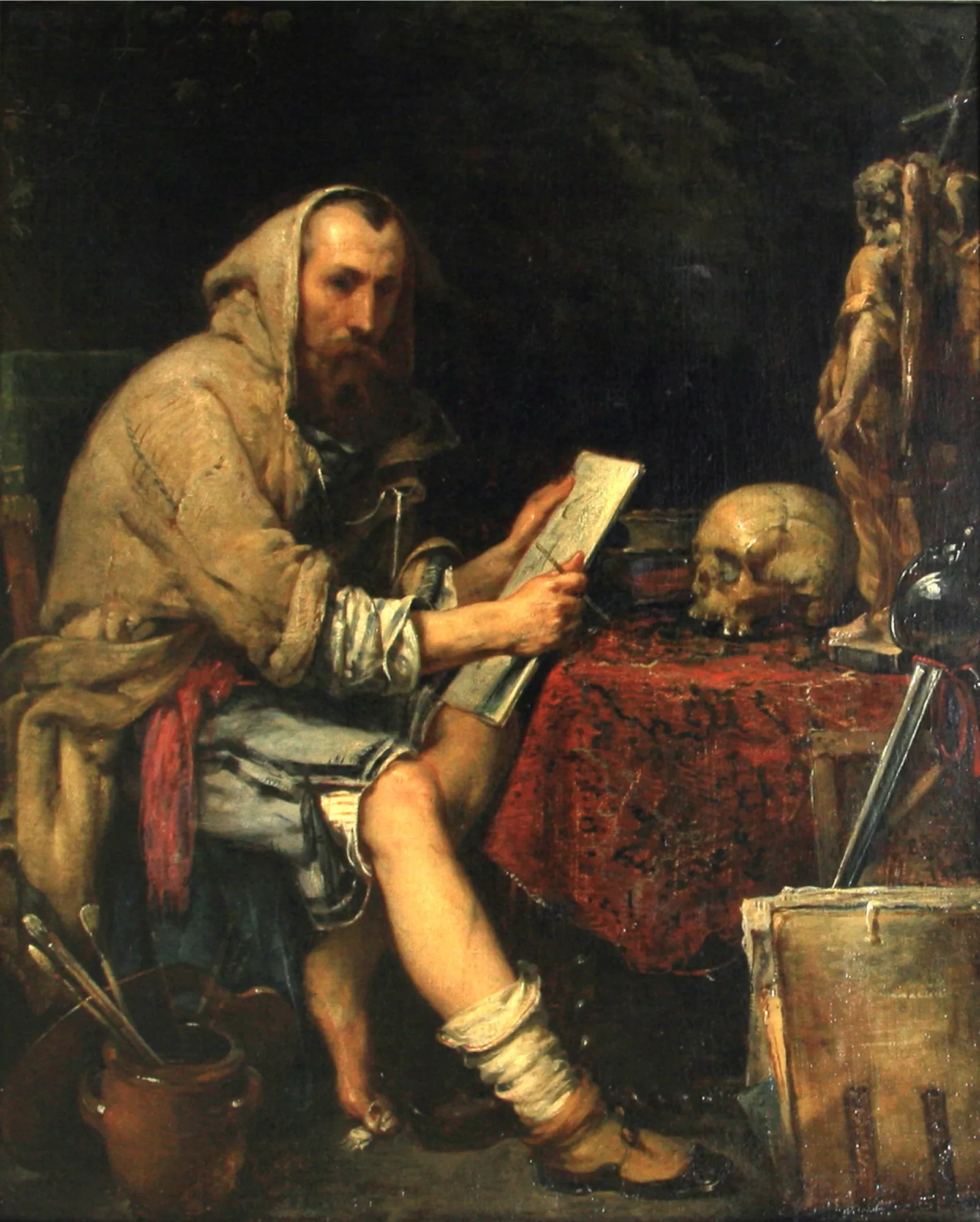 Le sujet est censé représenter l’artiste de génie, un porte crayon et non un pinceau en main, assis à une table et fixant le spectateur d’un air impérieux. Le peintre apparaît occupé à dessiner la statuette d’un ange élevant une croix, devant laquelle est posé un crâne.