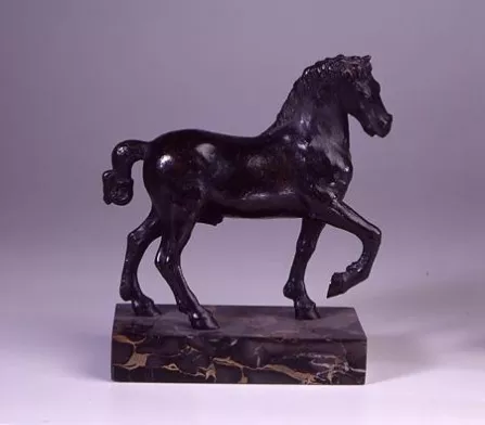 Ce cheval qui va l'amble, les deux pattes droites en avant, penche doucement le tête du côté droit. L'extrémité de sa queue est nouée par un ruban.