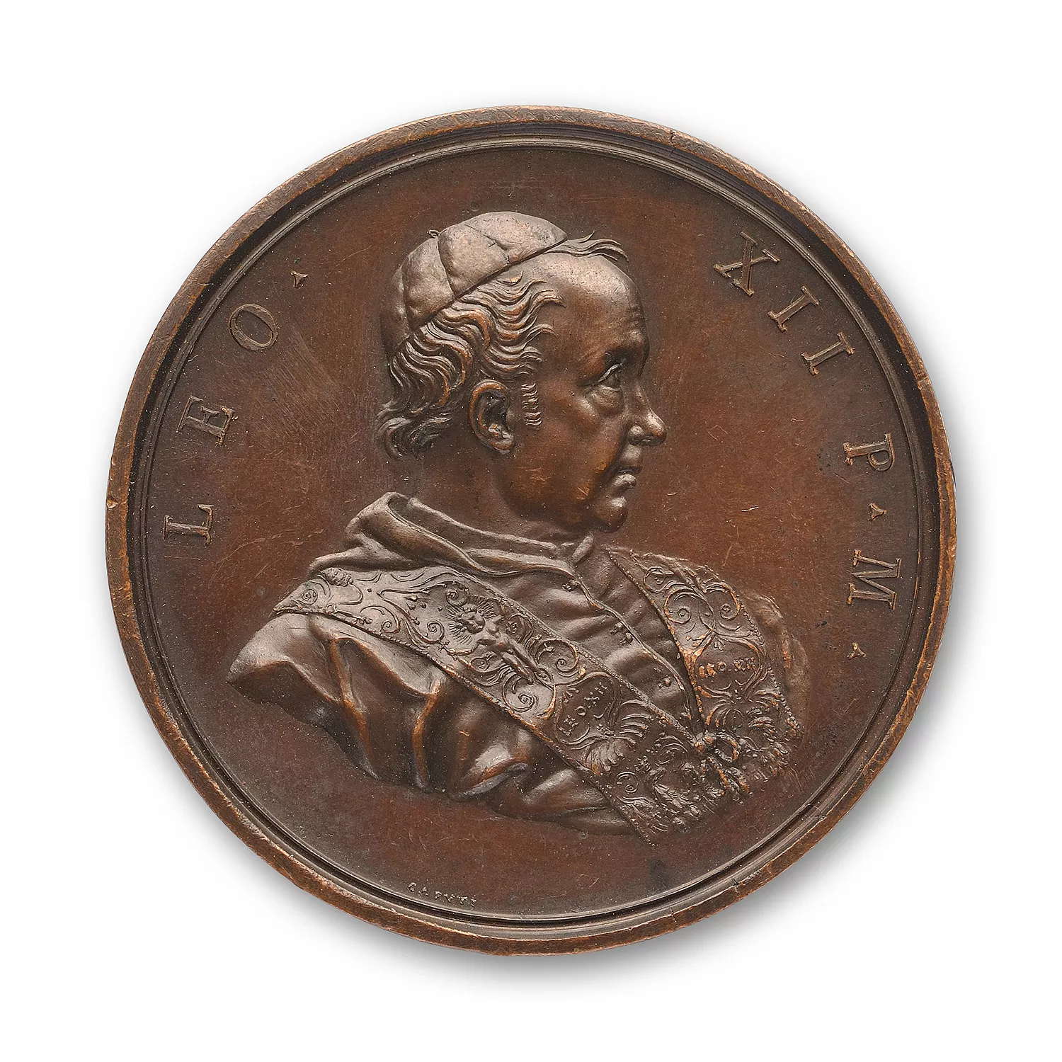 Buste de Léon XII vu de trois quarts en avant, portant la calotte, la chasuble et une étole décorée d'une tiare, d'un putto, l'inscription LEO.XII et l'aigle.