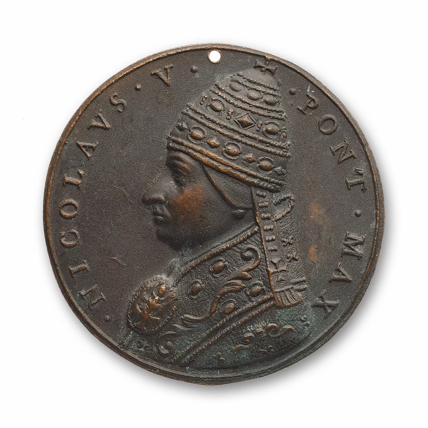 Buste de Nicolas V à gauche, avec tiare et étole décorée d'arabesques