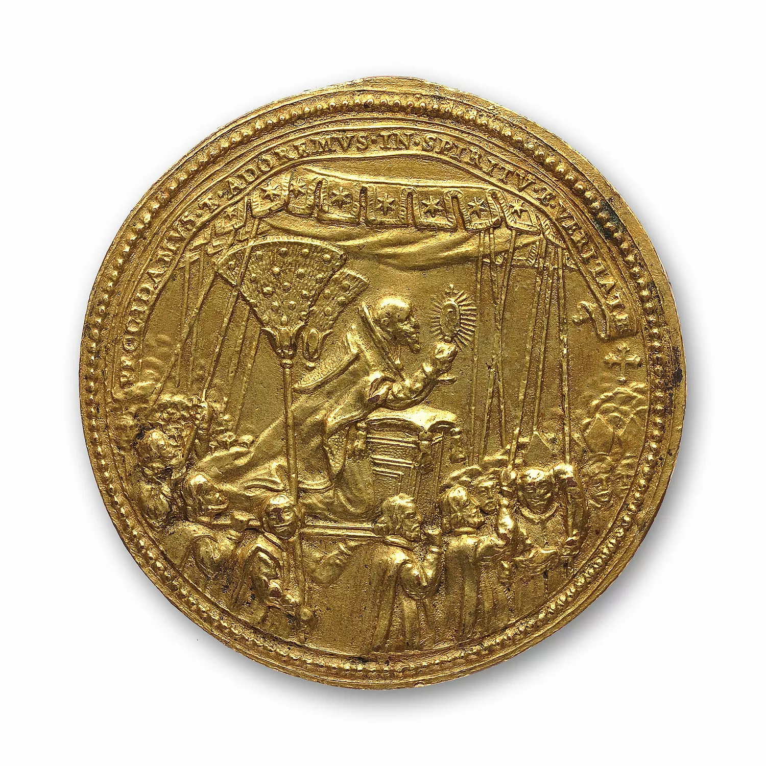 Le Pontife en procession, agenouillé sous un baldaquin, levant l'Ostensoir.