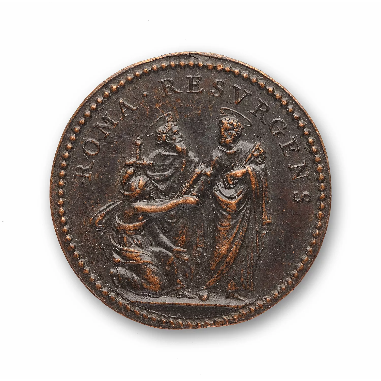 Figure de Rome agenouillée tendant la main à saint Pierre tenant les clé, derrière saint Paul tenant une épée.