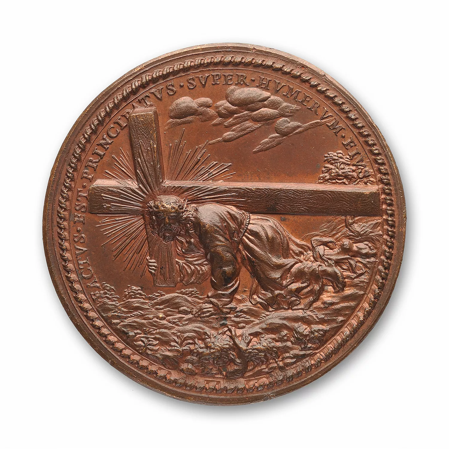 Le Christ à genoux, portant sa croix, dans un paysage