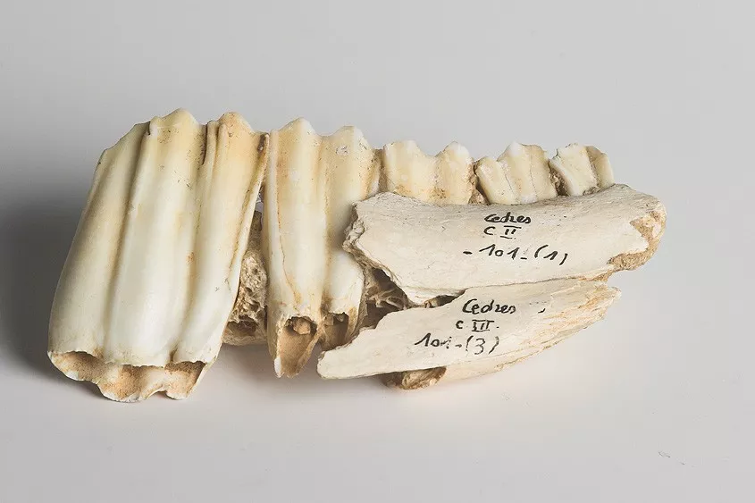 Hemitragus cedrensis Crégut-Bonnoure - TYPE - Crégut-Bonnoure, 1989, pl.1, fig.9 - 1995, p.73, fig.4 - Mandibule gauche(1 à 3) (fouilles A.Defleur; Dépôt DRAC-PACA)