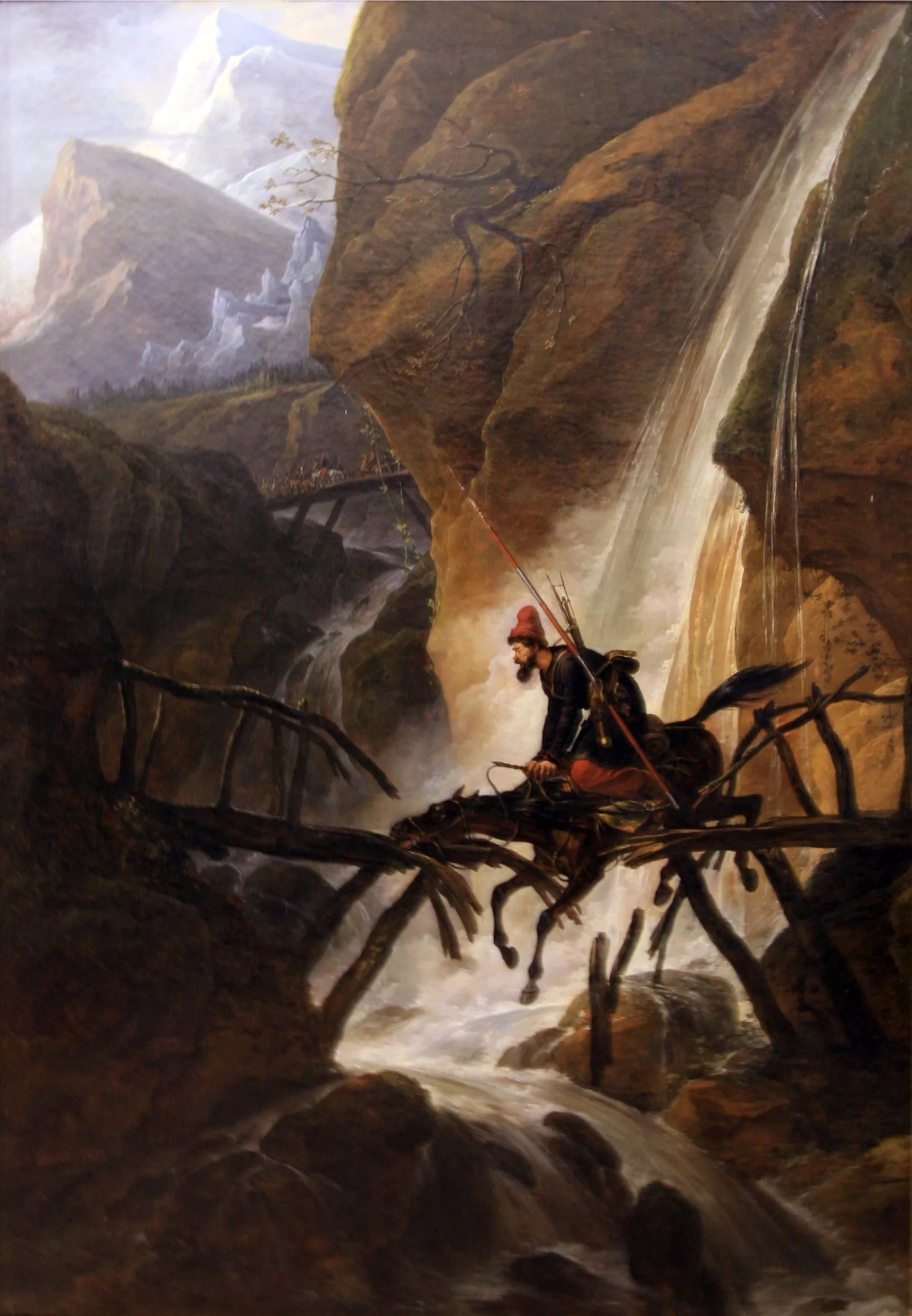 Le tableau « Cosaque à cheval » représente l'un des épisodes de la campagne suisse du général russe Souvorov à l'époque des guerres napoléoniennes et de la campagne d'Italie. Seule une confiance illimitée dans leur commandement et la foi dans le succès semble pousser ces hommes en avant. On peut voir la détermination qui se lit sur son visage, il mesure d’un œil inquiet le danger qu’il court en traversant à cheval un pont au dessus d’un torrent qui se brise sous leur poids.