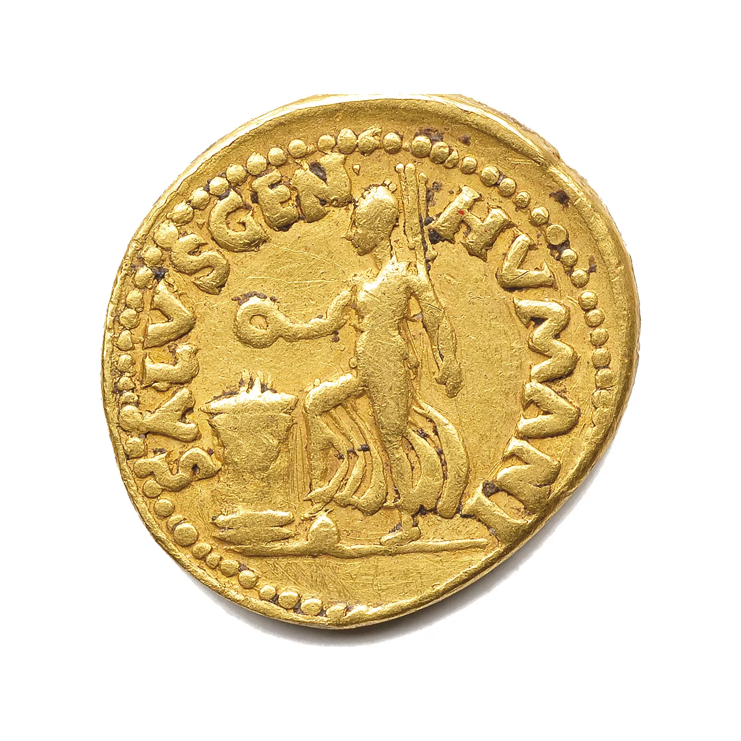 Salus-Fortuna avançant à droite, sacrifiant avec une patère au-dessus d'un autel, le pied sur un globe, tenant un gouvernail vertical
