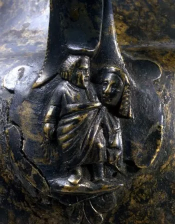 Détail d'un pot à embouchure ronde et anse richement ornée