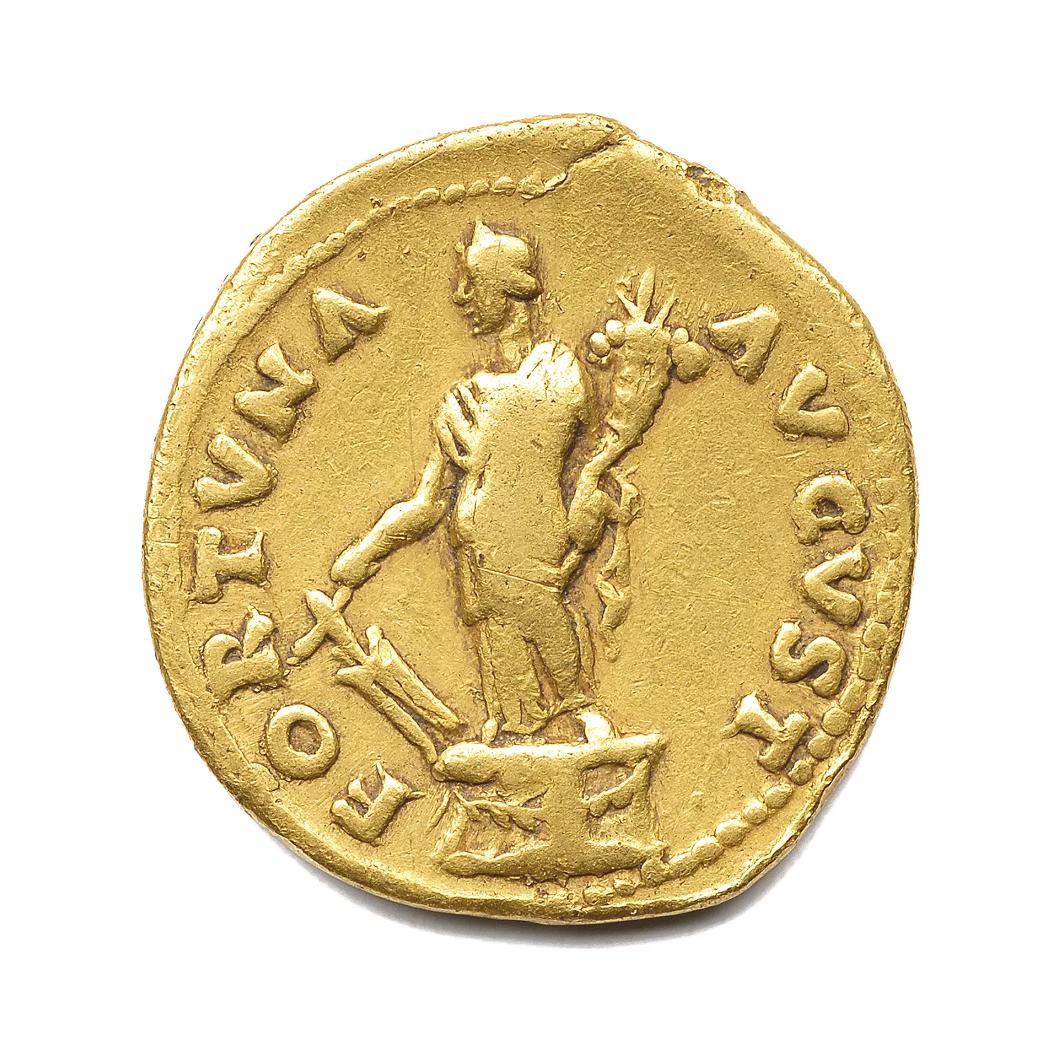 Fortuna debout à gauche sur un autel, tenant un gouvernail et une corne d'abondance