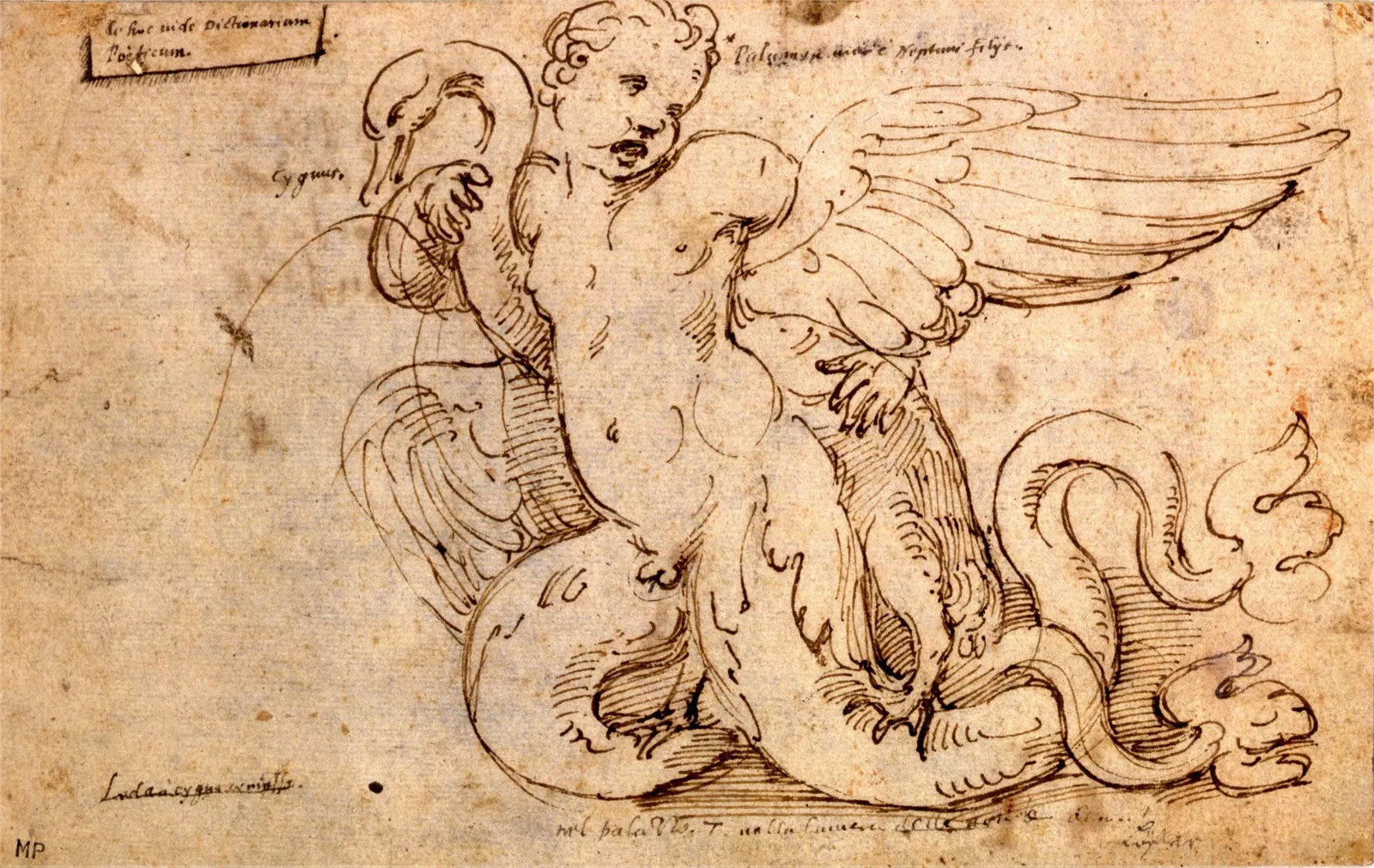 Le sujet, inspiré des mythes grecs, reste mystérieux. Il est possible de voir un enfant-triton, Palémon, le fils d'Athamas, transformé par Poséidon en créature marine. La figure du cygne pourrait être Cycnos, roi des Ligures amoureux de Phaéton, le malheureux fils d'Apollon, ou Cycnos le fils de Poséidon et Cylcaé tué par Achille, ou Cycnos le fils d'Apollon et Thyria, un beau jeune homme mené au suicide par son orgueil.
