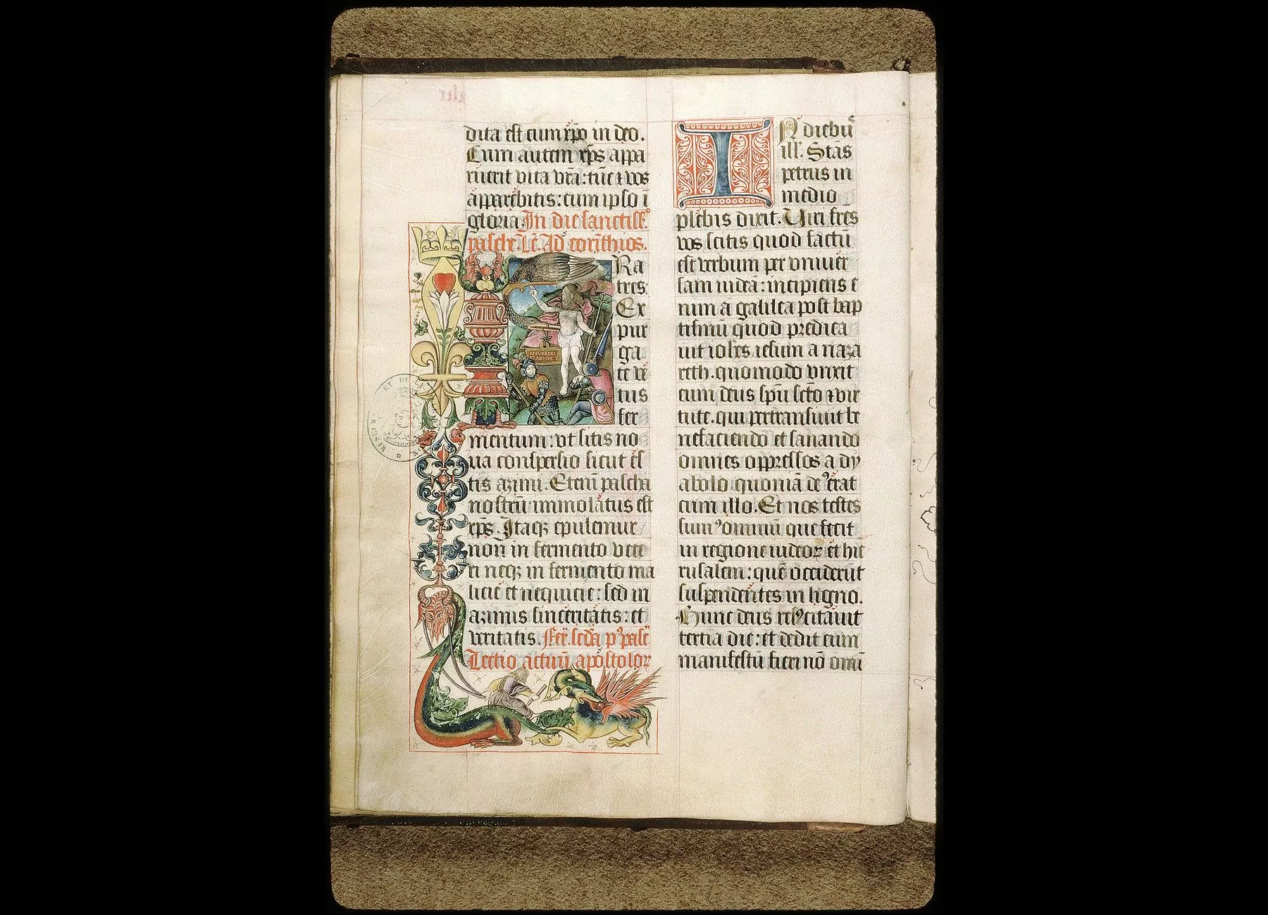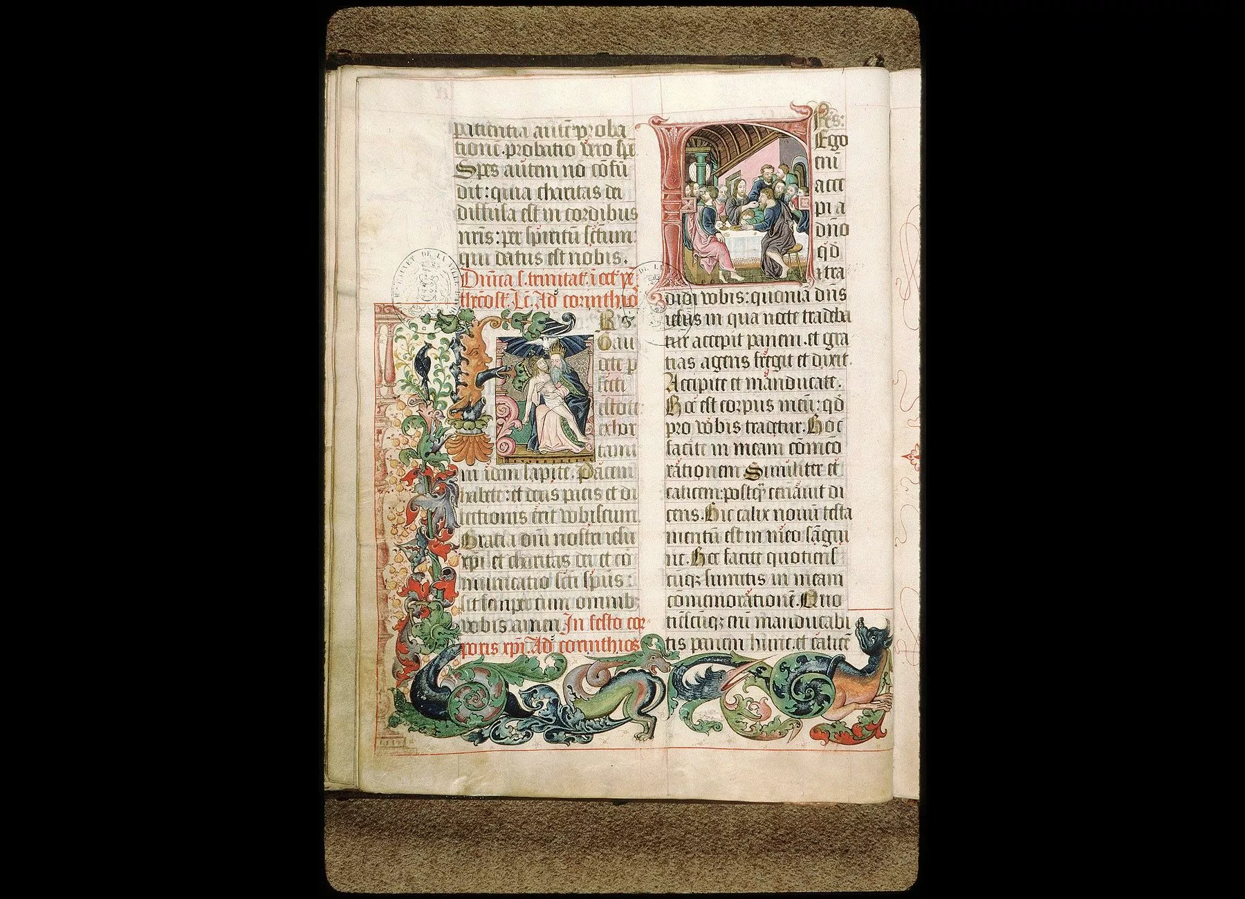 Commentaires de Labande. XVIe siècle. Parchemin. 100 feuillets, manquent les fol. 74 et 82.390 sur 285 millim. Un certain nombre d'initiales avec miniatures,dont voici les principales : Fol. 1. S. Paul- encadrement de la page avec ornements renaissance, lambrequins, feuillages, oiseaux. Fol. 5. La Nativité- en marge, un cèdre, avec un pied d'hysope. Fol. 7 v°. L'Enfant Jésus couché sur la paille sous un riche baldaquin-en marge, deux grands hérons. Fol. 49 v°. La Résurrection- une cigogne tient dans son bec un cartouche avec inscription- en marge,fleur de lis couronnée, dragons. Fol. 54 v°. L'Ascension- en marge, licorne à deux têtes. Fol. 55 v°. La Pentecôte. Fol. 59 v°. La Trinité, Dieu le Père tient sur ses genoux son Fils mort- la Cène-en marge, motifs d'architecture, mascarons, animaux fantastiques, etc. Fol. 71. S. André et sa croix. Fol. 72 v°. La Purification. Fol. 75. S. Pierre. Fol. 75 v°. S. Paul. Fol. 78. Couronnementde la Vierge; au verso, S. Michel terrassant le démon- en marge dans les ornements, buste nu d'un homme tenant un bouclier et unesorte d'étendard, avec un cartouche qui porte la date de 1548. Fol. 79. S. Jean écrivant l'Apocalypse- au verso, groupes de saints. Fol. 81. S. Benoît- dans les marges, lion et salamandre- au verso,S. Pierre Célestin, et une figuration du S. Esprit. Fol. 83 v°. LeSauveur bénissant. Fol. 85. Bourreau décapitant un martyr. Fol. 90. Prélat écrivant sur un pupitre. Fol. 93. Saintes en prières. Fol. 95 v°. Scène macabre, deux morts, dont l'un frappe du tambour.Les autres initiales alternativement rouges et bleues sont richementornementées. Rel. bois, recouvert de peau gaufrée, ornée defleurs de lis et de dessins variés. Ces fleurs de lis, semées partout,pourraient faire supposer que ce manuscrit a été exécuté chez les Célestins d'Avignon, qui se disaient de fondation royale, Charles V s'étant déclaré, en 1393, le fondateur et le protecteur de leur monastère. (Célestins d'Avignon, 1 B 90.)