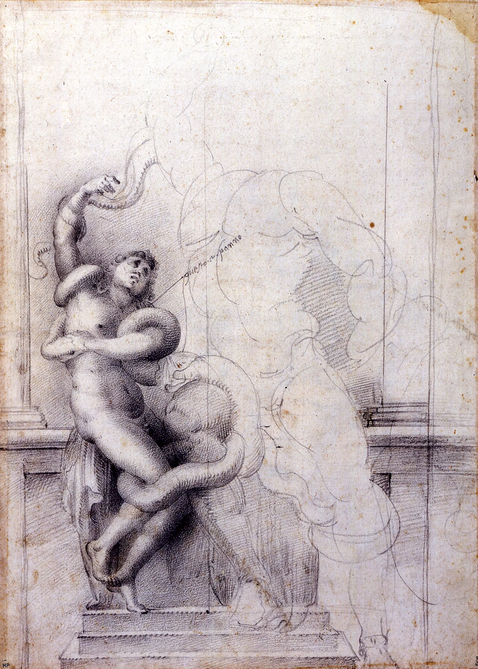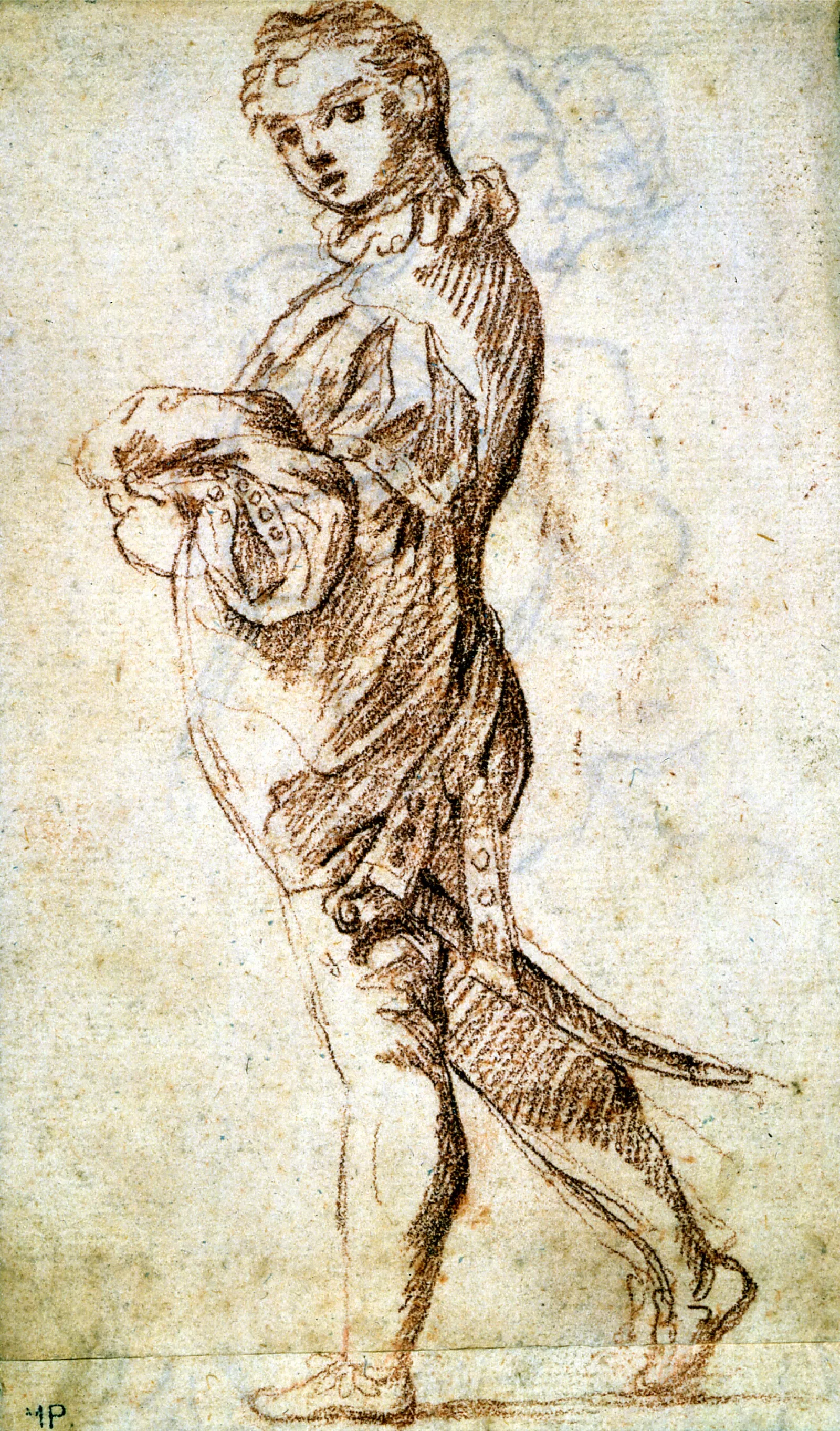 Sanguine, papier crème collé en plein (les pieds sont sur une bande rapportée, et la sanguine est plus claire)