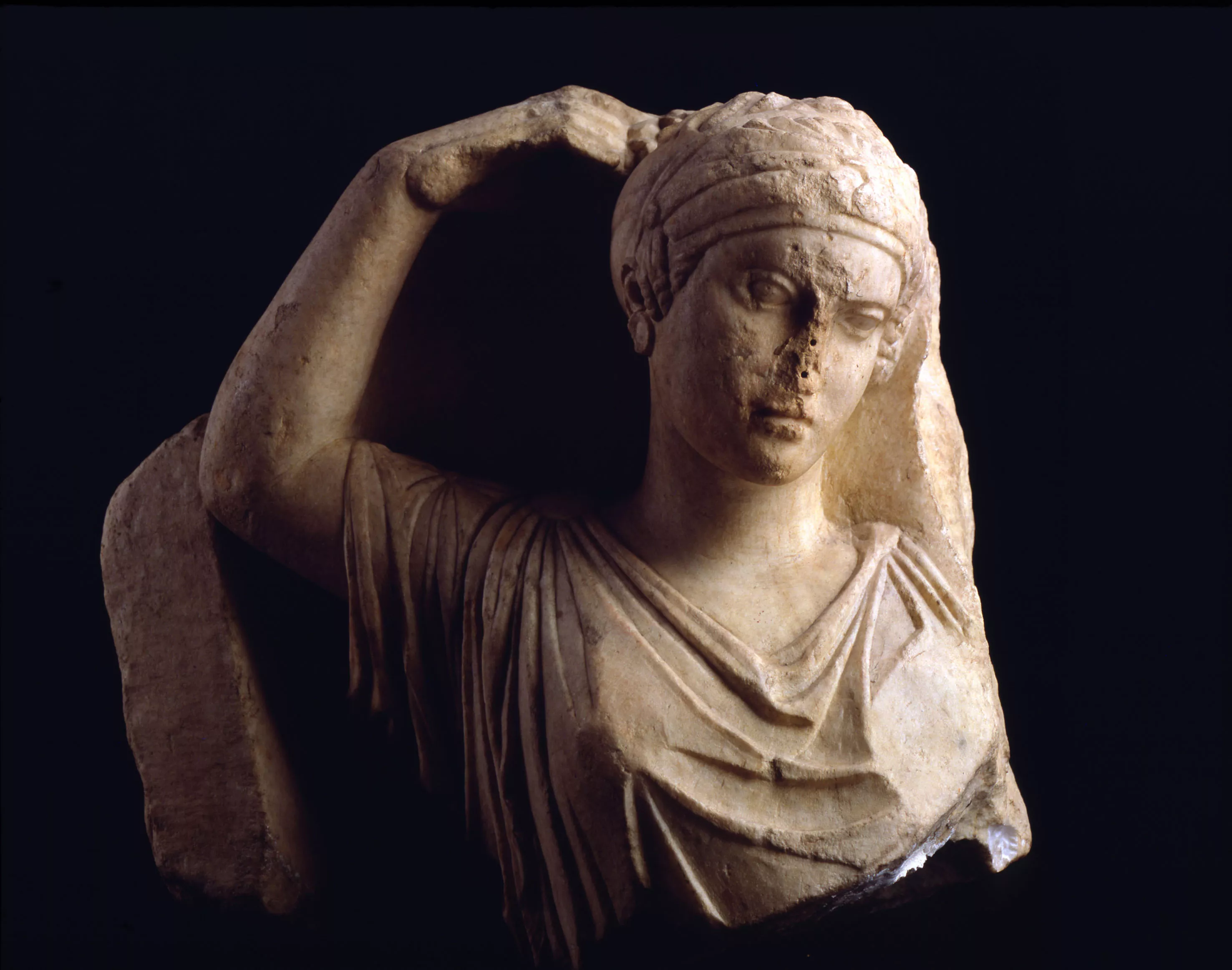 Subsistent la tête et une partie du buste d’une jeune femme, en très haut relief, presque en ronde bosse. Manquent le couronnement et la partie inférieure de la plaque. A gauche, une jeune femme, coiffée d’un cécryphale (une sorte de résille entourant la chevelure nouée en chignon), parée d’une boucle d’oreille ronde, vêtue d’un chiton (tunique très fine) à manches agrafées par des petits boutons et d’un péplos (vêtement de laine lourde et épaisse) retenu sur les épaules par des boucles rondes, porte la main à sa chevelure. De l’autre main, la jeune femme vérifiait sans doute l’ordonnance de sa coiffure dans un miroir. Ce motif, exceptionnel, n’est attesté que sur un autre document, une stèle découverte récemment à Rhamnonte (Attique).