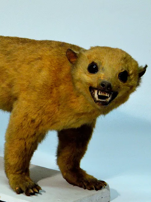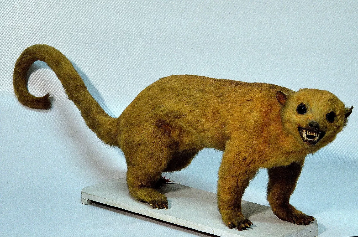Le kinkajou est un mammifère vivant dans les arbres, la nuit, dans les forêts humides guyanaises, en Amazonie, les Andes et l'Amérique Centrale. Il mesure, sans la queue, entre 45 et 76cm, et entre 85 et 133cm avec. Sa queue est préhensile - signifiant qu'il peut s'accrocher avec pour se déplacer ou se nourrir - et fait la taille de son corps, ce qui est un phénomène rare pour un animal carnivore.