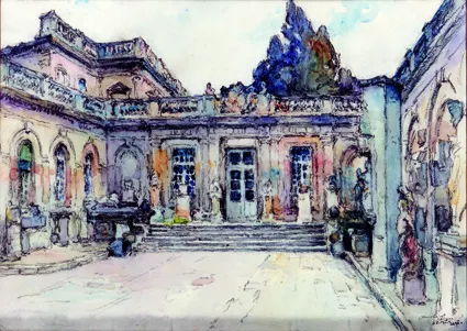 L'aquarelle de Louis Montagné - elle même une acquisition de 1997, montre La Cour du musée Calvet devenue salle d'exposition en plein air, au grand dam des règles les plus élémentaires de la conservation. Nous sommes là avant 1910, des cartes postales contemporaines permettent de dater l’aquarelle à peu près sûrement - et avant que Joseph Girard ne réinstalle en 1933 les collections d'archéologie à la chapelle des Jésuites dévolue au musée pour y déployer ses antiques. Plusieurs sont perceptibles sur cette feuille, notamment les Masques funéraires placés de part et d'autre de I ‘entrée.