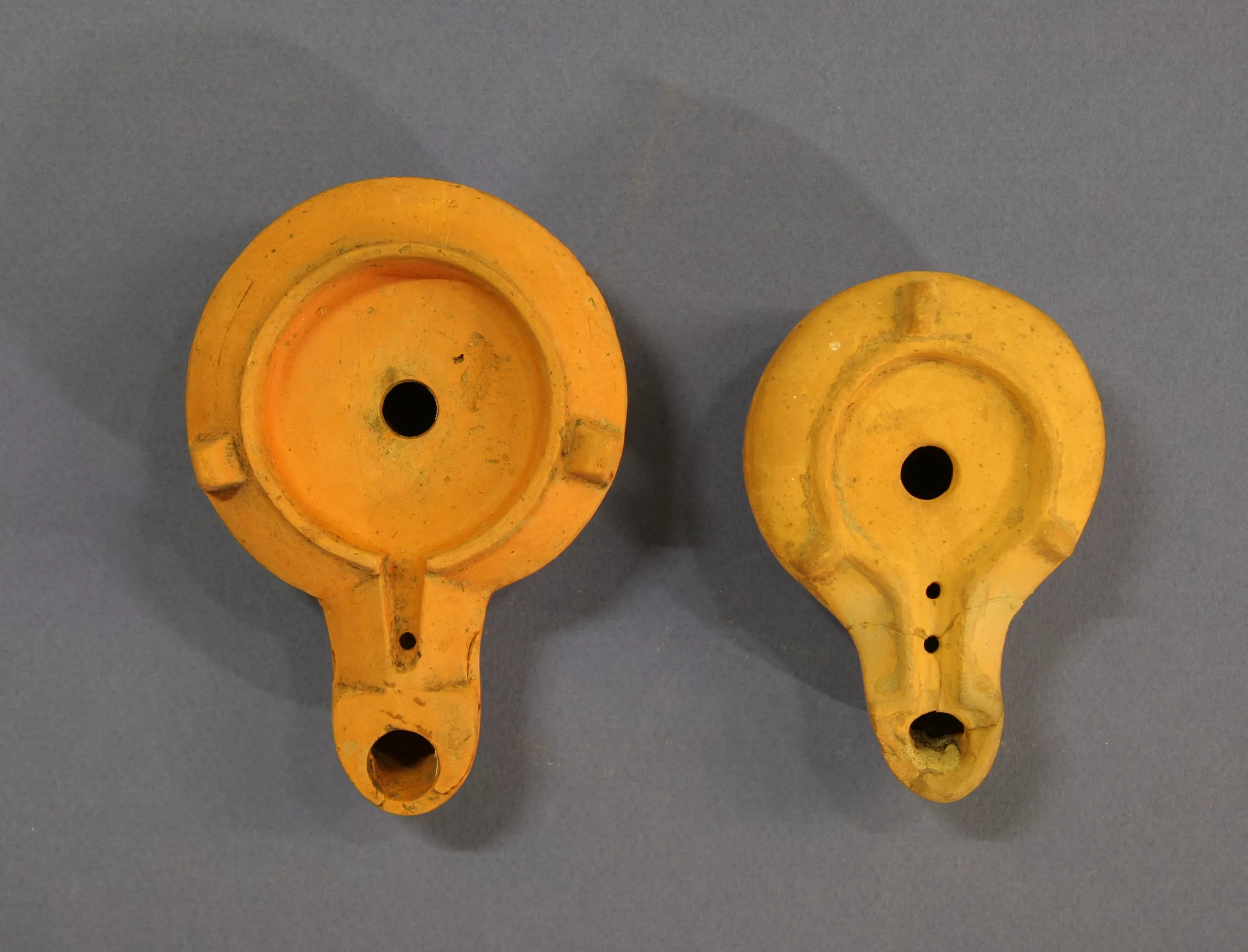 Lampes à huile d’époque impériale à l’origine importées d’Italie mais également copiées par différents ateliers provinciaux : ces lampes dites « à canal » ou firmalampen se caractérisent par l’existence d’un canal reliant le bec au médaillon et très souvent par la présence sous le fond de la signature en relief du potier qui les a fabriquées ; lampe de type Loeschcke IXc signée FORTIS et lampe de type Loeschcke X.