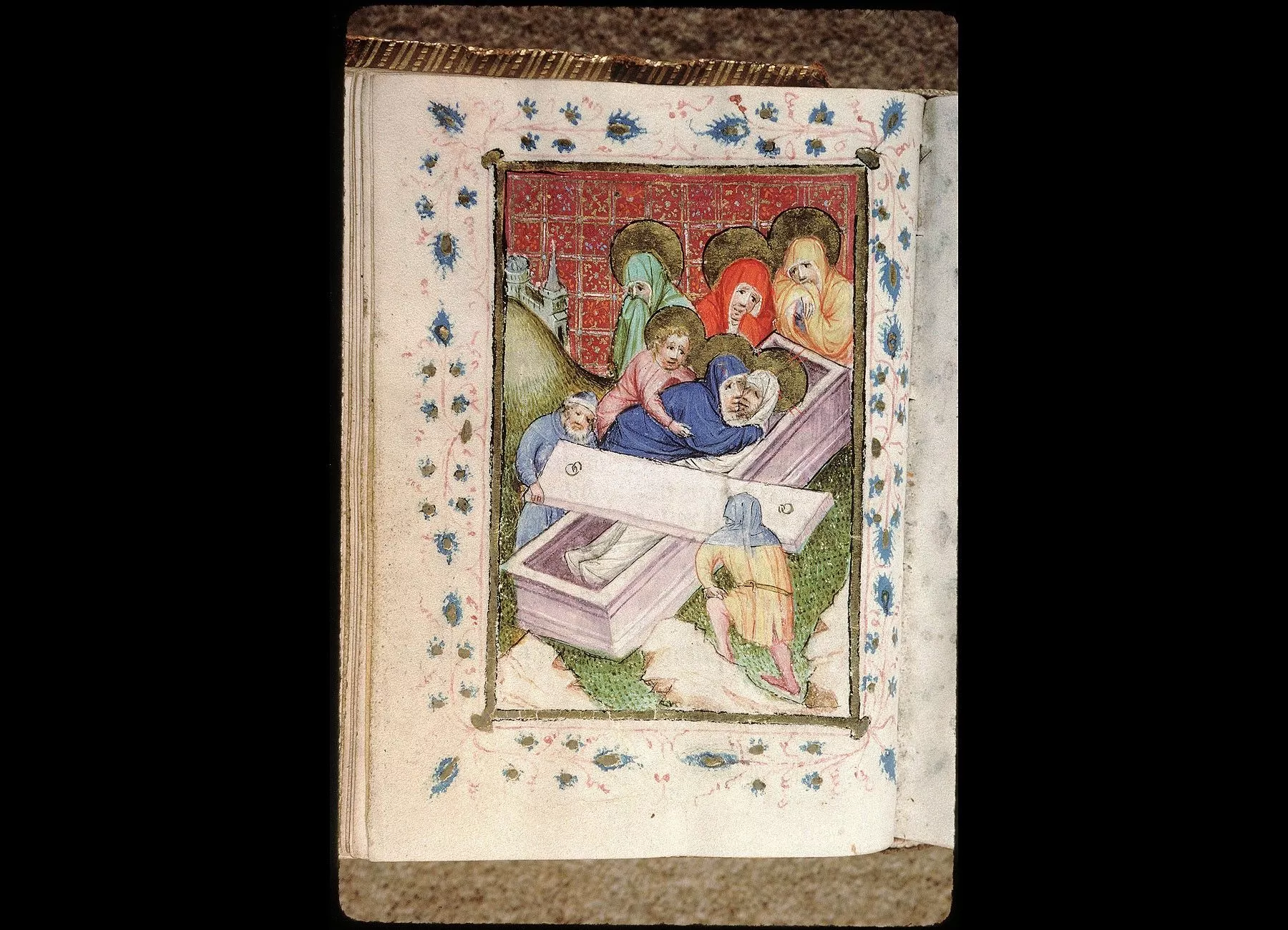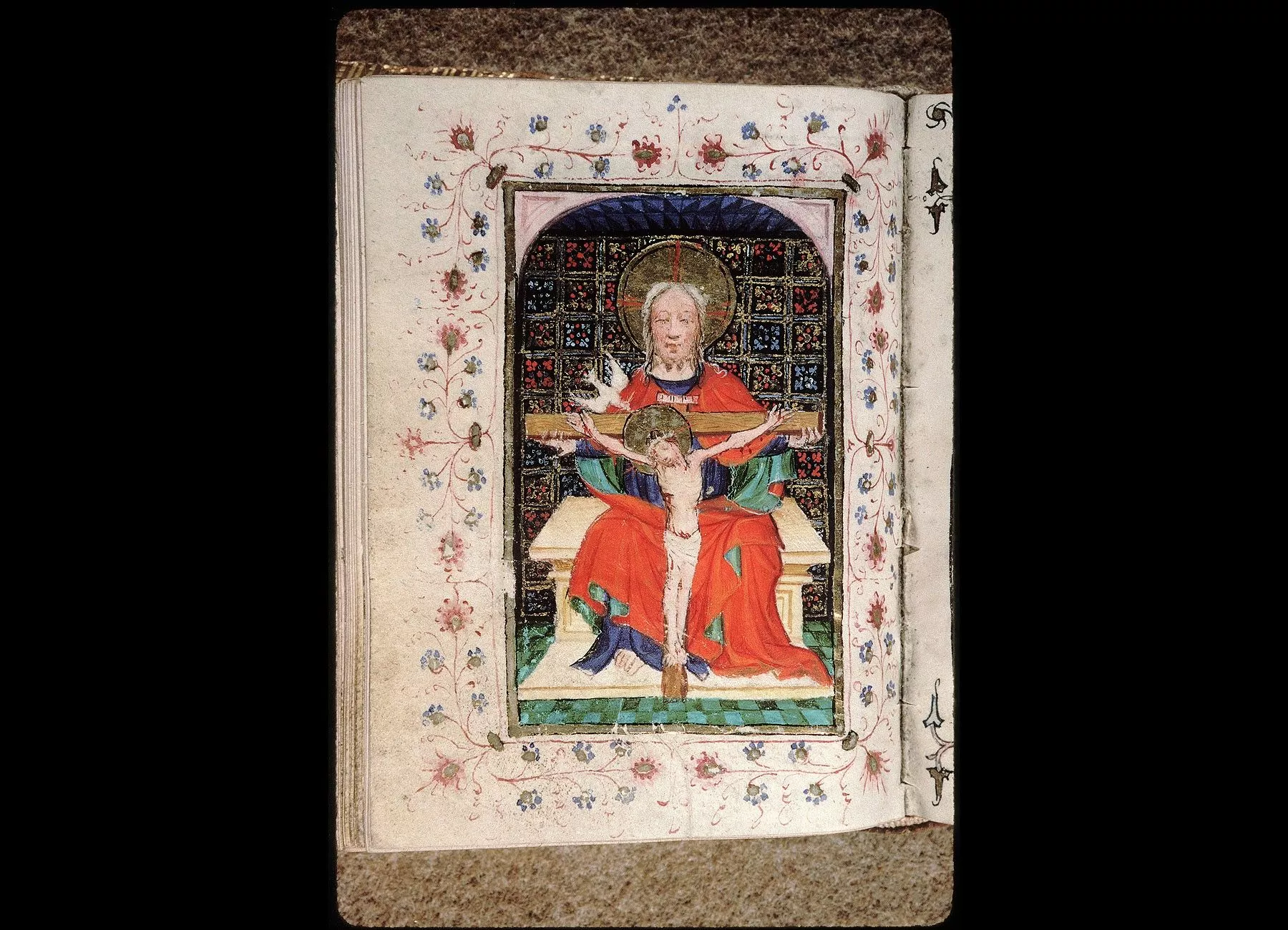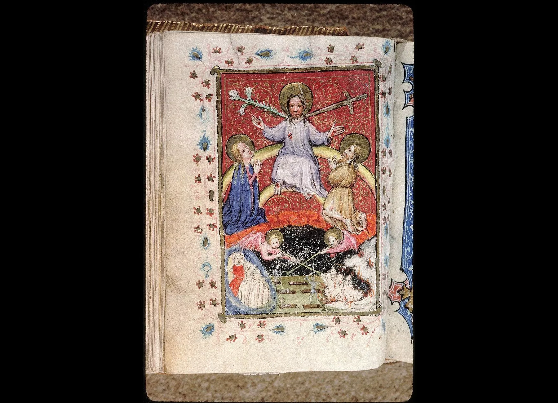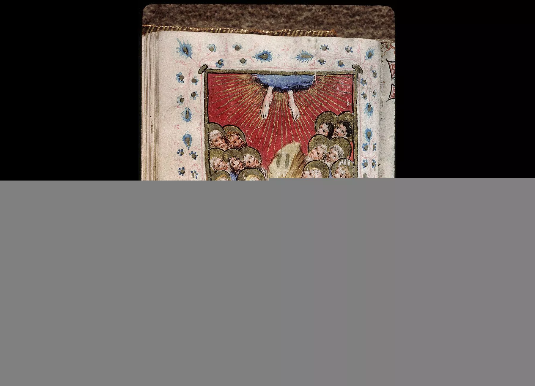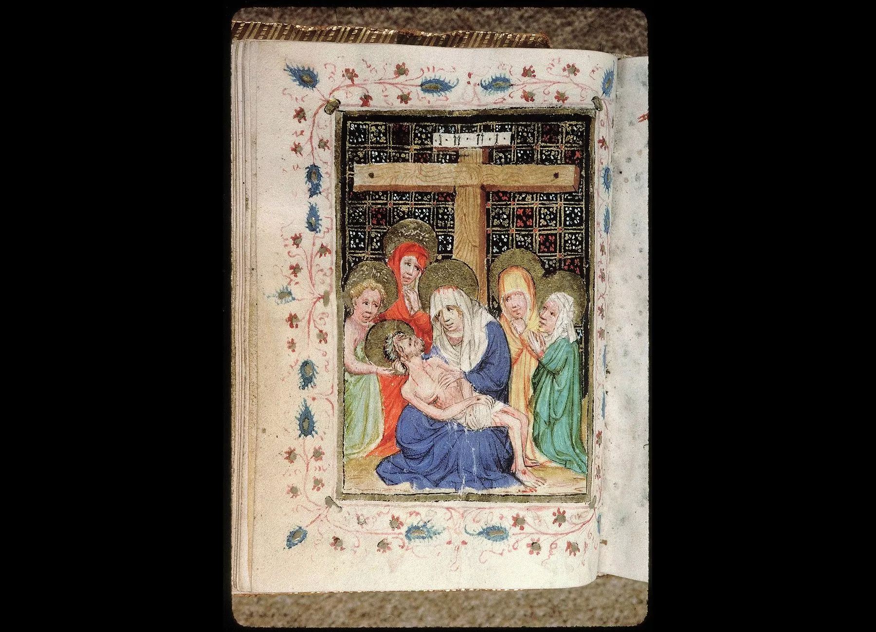 Commentaires de Labande. Commencement du XVe siècle. Vélin. 260 feuillets. 114 sur 78 millim. Miniatures à pleines pages : fol. 21 v°, la sainte Face; fol. 23 v°, la Nativité; fol. 26 v°, la Circoncision; fol. 27 v°,l'Adoration des mages; fol. 29 v°, la Cène; fol. 31 v°, l'Agonieau jardin des Oliviers; fol. 32 v°, le Baiser de Judas; fol. 33 v°,la Flagellation; fol. 37 v°, le Christ en croix; fol. 40 v°, la Descente de croix; fol. 41 v°, Mater dolorosa; fol. 42 v°, la Mise au tombeau; fol. 43 v°, la Résurrection; fol. 44 v°, le Christ aux limbes; fol. 45 v°, Apparition du Christ à la Madeleine;<br>fol. 46 v°, l'Ascension;<br>fol. 47 v°, la Pentecôte;<br>fol. 48 v°,le Jugement dernier;<br>fol. 75 v°, Ecce homo; fol. 139 v°, la Trinité; fol. 202 v°, l'Annonciation; fol. 215 v°, la Vierge et l'Enfant; fol. 240 v°, le Couronnement de la Vierge; fol. 249 v°,la Vierge glorifiée et l'Enfant. Au commencement de chaque partie,initiale d'or ou sur fond d'or, avec ornements qui forment l'encadrement de la page. Rel. veau. (Don du chanoine Collet, 1839.)