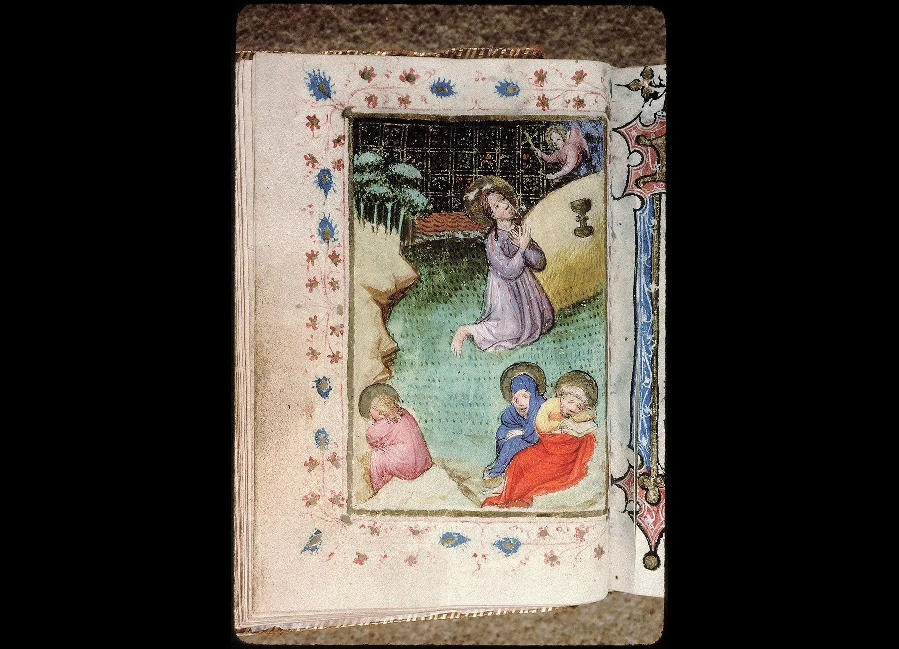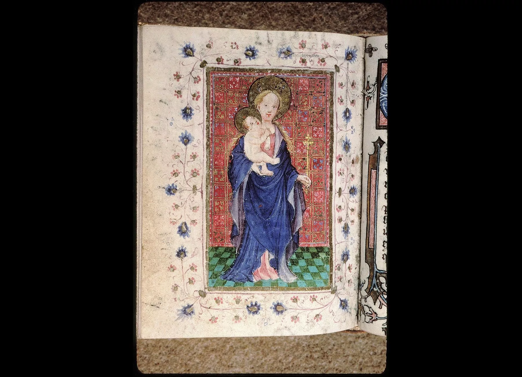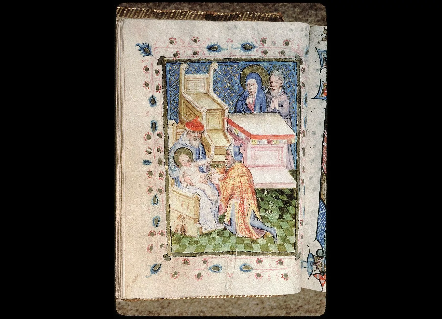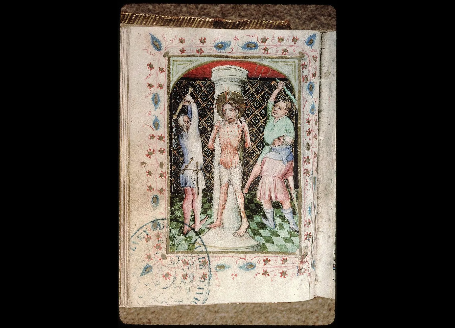 Commentaires de Labande. Commencement du XVe siècle. Vélin. 260 feuillets. 114 sur 78 millim. Miniatures à pleines pages : fol. 21 v°, la sainte Face; fol. 23 v°, la Nativité; fol. 26 v°, la Circoncision; fol. 27 v°,l'Adoration des mages; fol. 29 v°, la Cène; fol. 31 v°, l'Agonieau jardin des Oliviers; fol. 32 v°, le Baiser de Judas; fol. 33 v°,la Flagellation; fol. 37 v°, le Christ en croix; fol. 40 v°, la Descente de croix; fol. 41 v°, Mater dolorosa; fol. 42 v°, la Mise au tombeau; fol. 43 v°, la Résurrection; fol. 44 v°, le Christ aux limbes; fol. 45 v°, Apparition du Christ à la Madeleine;<br>fol. 46 v°, l'Ascension;<br>fol. 47 v°, la Pentecôte;<br>fol. 48 v°,le Jugement dernier;<br>fol. 75 v°, Ecce homo; fol. 139 v°, la Trinité; fol. 202 v°, l'Annonciation; fol. 215 v°, la Vierge et l'Enfant; fol. 240 v°, le Couronnement de la Vierge; fol. 249 v°,la Vierge glorifiée et l'Enfant. Au commencement de chaque partie,initiale d'or ou sur fond d'or, avec ornements qui forment l'encadrement de la page. Rel. veau. (Don du chanoine Collet, 1839.)