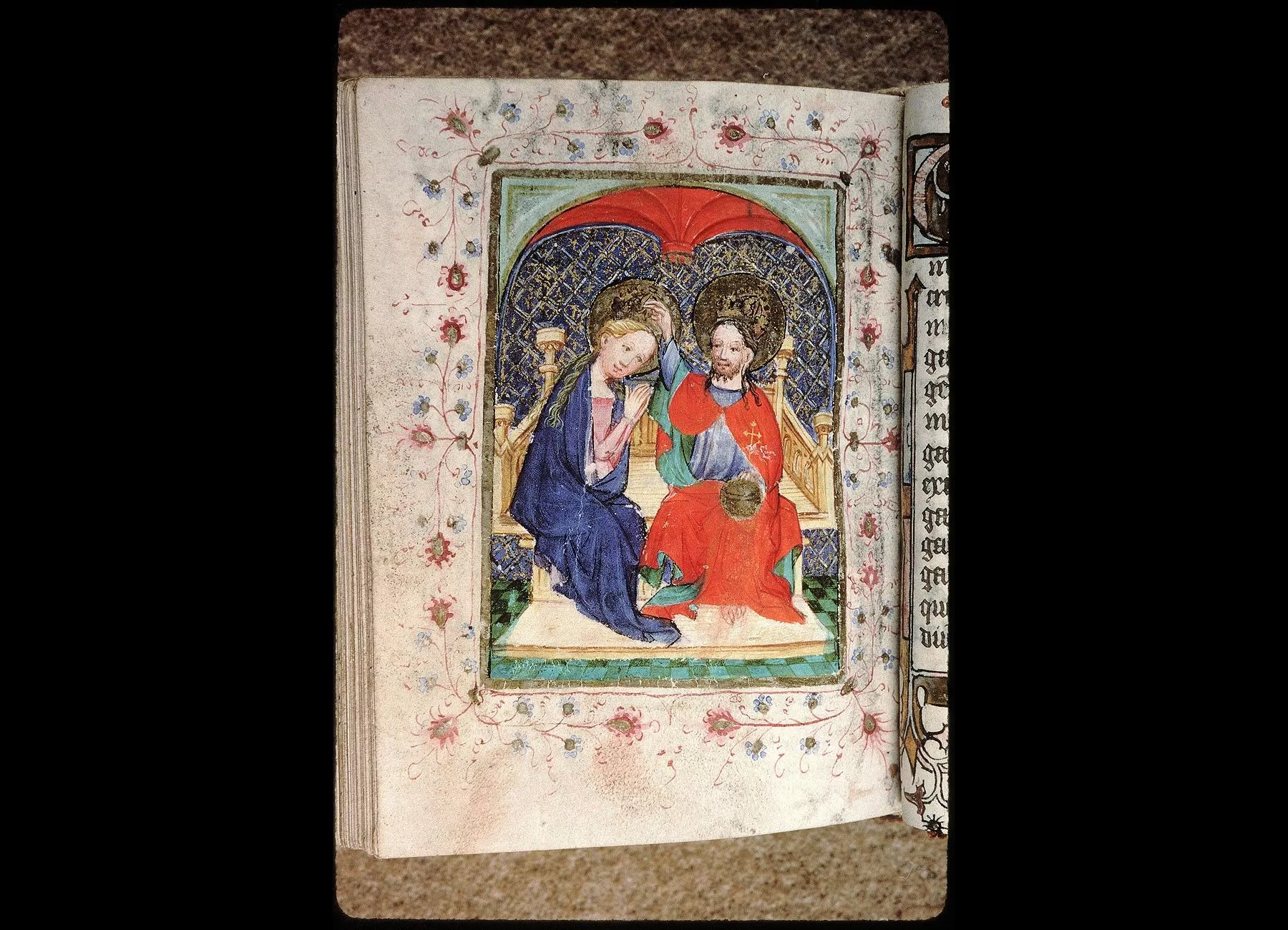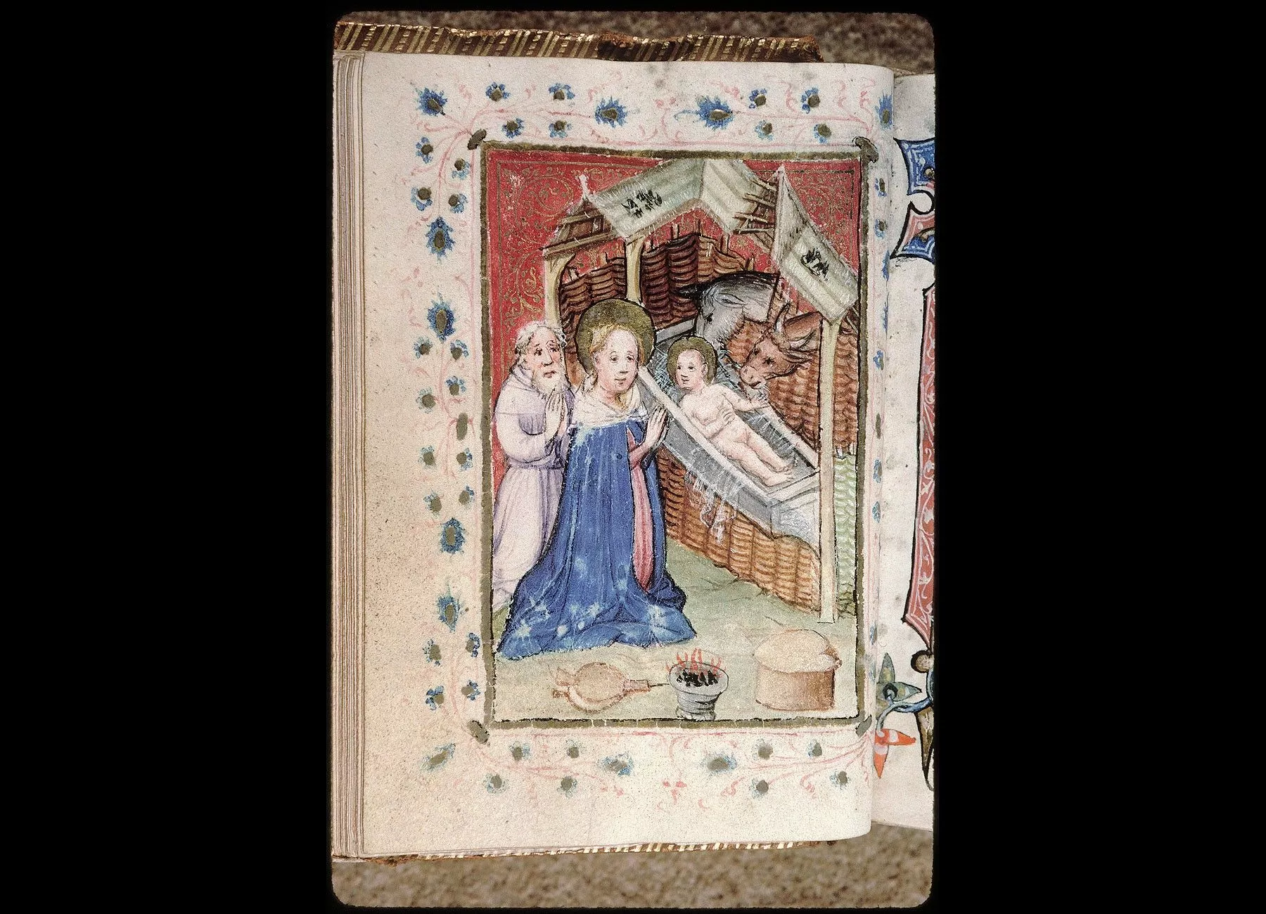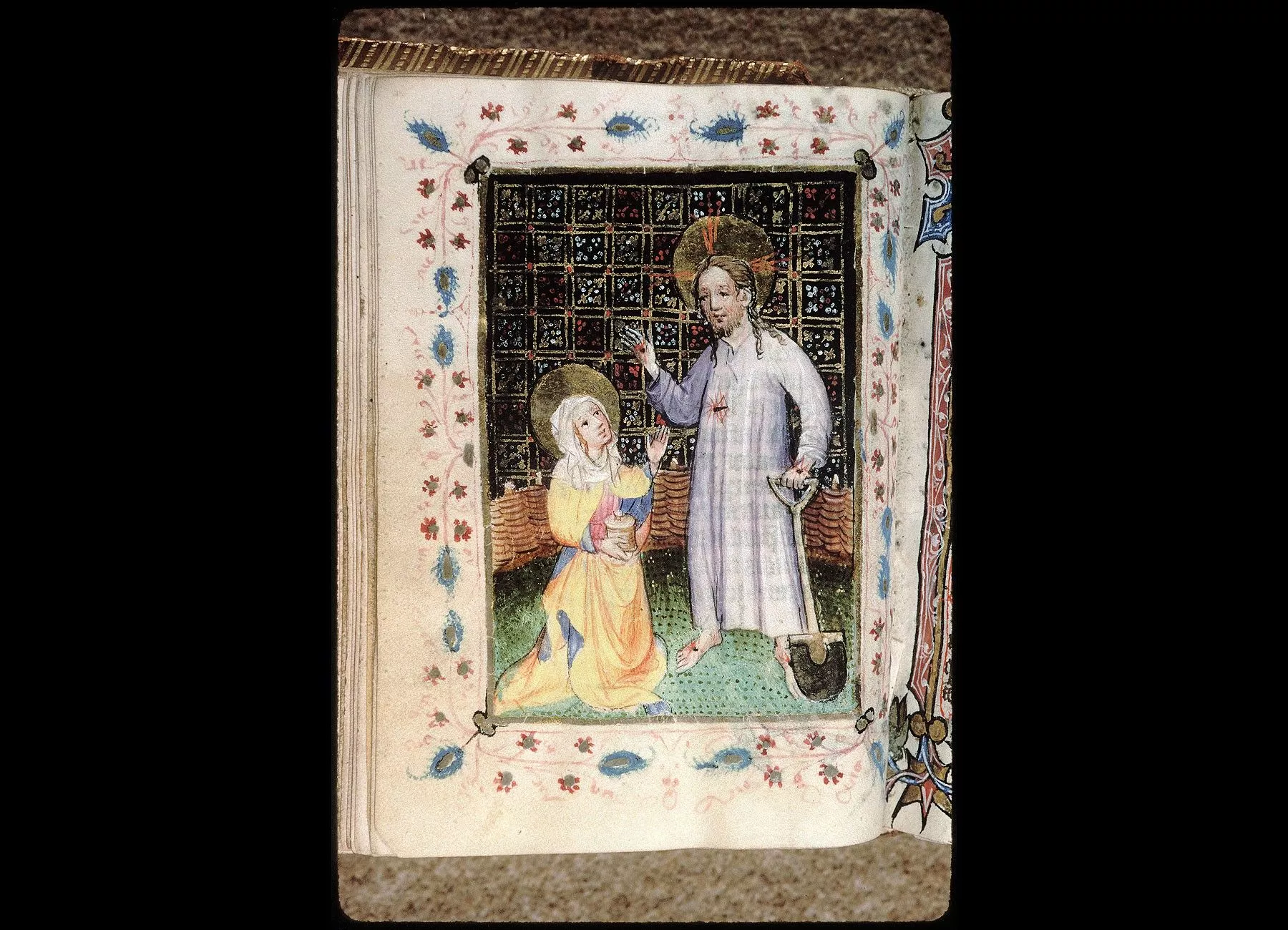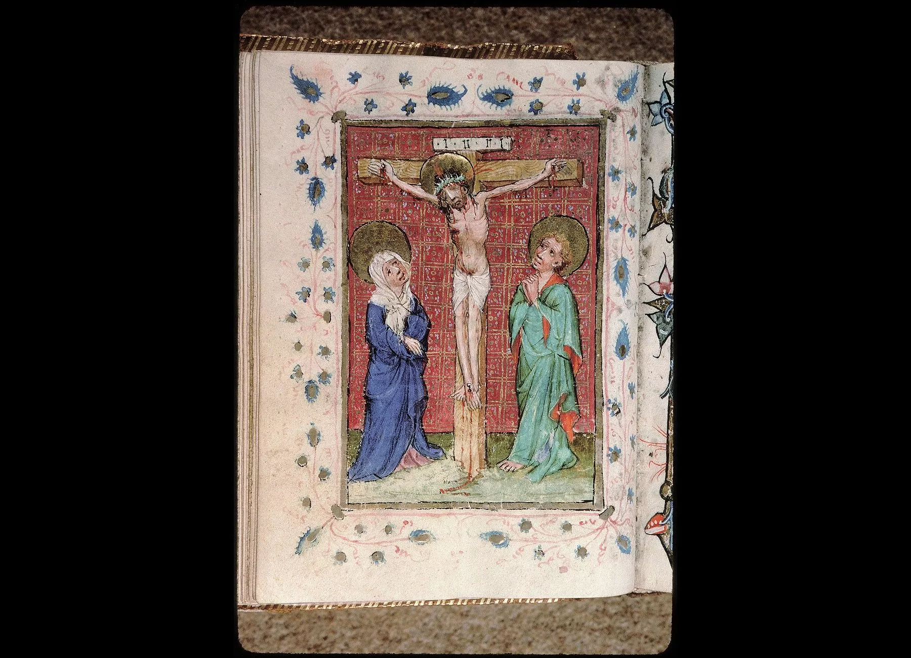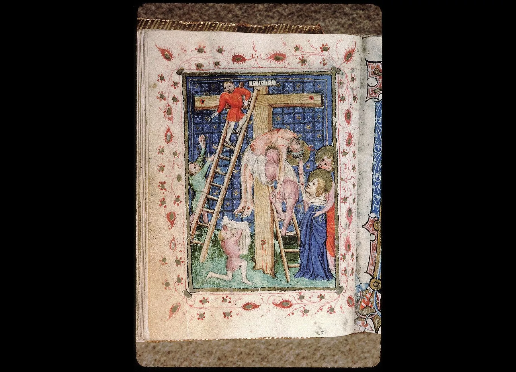 Commentaires de Labande. Commencement du XVe siècle. Vélin. 260 feuillets. 114 sur 78 millim. Miniatures à pleines pages : fol. 21 v°, la sainte Face; fol. 23 v°, la Nativité; fol. 26 v°, la Circoncision; fol. 27 v°,l'Adoration des mages; fol. 29 v°, la Cène; fol. 31 v°, l'Agonieau jardin des Oliviers; fol. 32 v°, le Baiser de Judas; fol. 33 v°,la Flagellation; fol. 37 v°, le Christ en croix; fol. 40 v°, la Descente de croix; fol. 41 v°, Mater dolorosa; fol. 42 v°, la Mise au tombeau; fol. 43 v°, la Résurrection; fol. 44 v°, le Christ aux limbes; fol. 45 v°, Apparition du Christ à la Madeleine;<br>fol. 46 v°, l'Ascension;<br>fol. 47 v°, la Pentecôte;<br>fol. 48 v°,le Jugement dernier;<br>fol. 75 v°, Ecce homo; fol. 139 v°, la Trinité; fol. 202 v°, l'Annonciation; fol. 215 v°, la Vierge et l'Enfant; fol. 240 v°, le Couronnement de la Vierge; fol. 249 v°,la Vierge glorifiée et l'Enfant. Au commencement de chaque partie,initiale d'or ou sur fond d'or, avec ornements qui forment l'encadrement de la page. Rel. veau. (Don du chanoine Collet, 1839.)