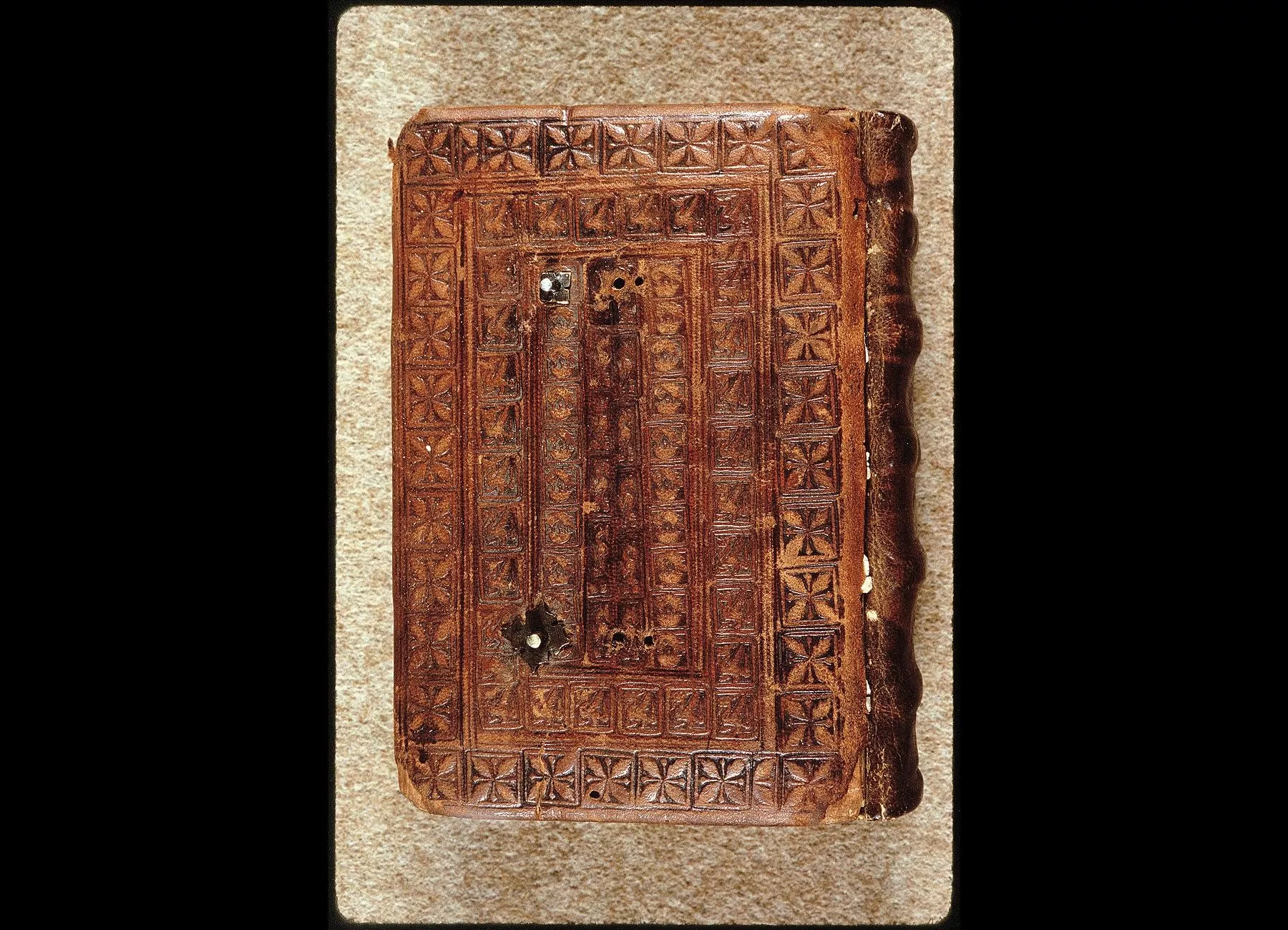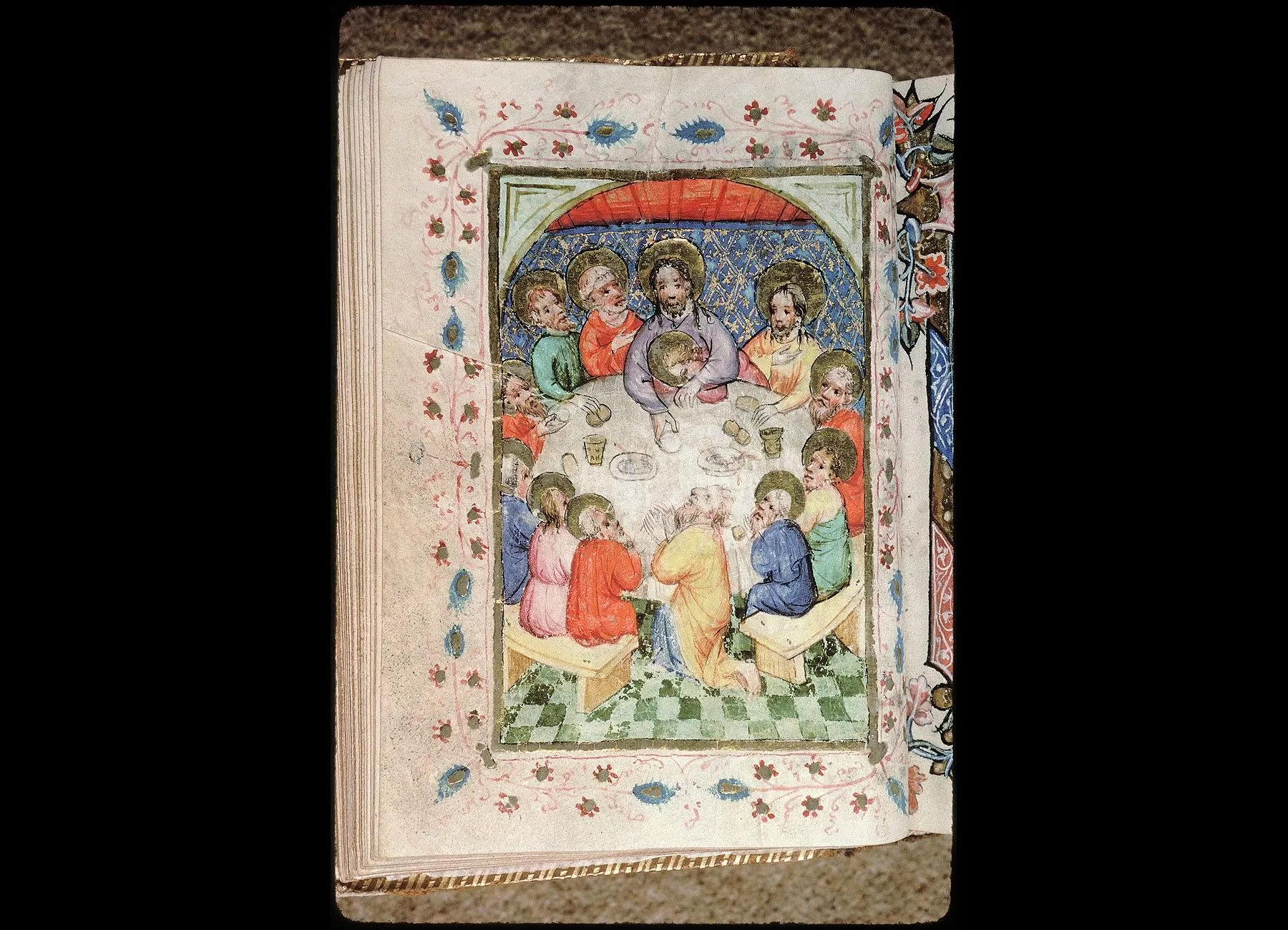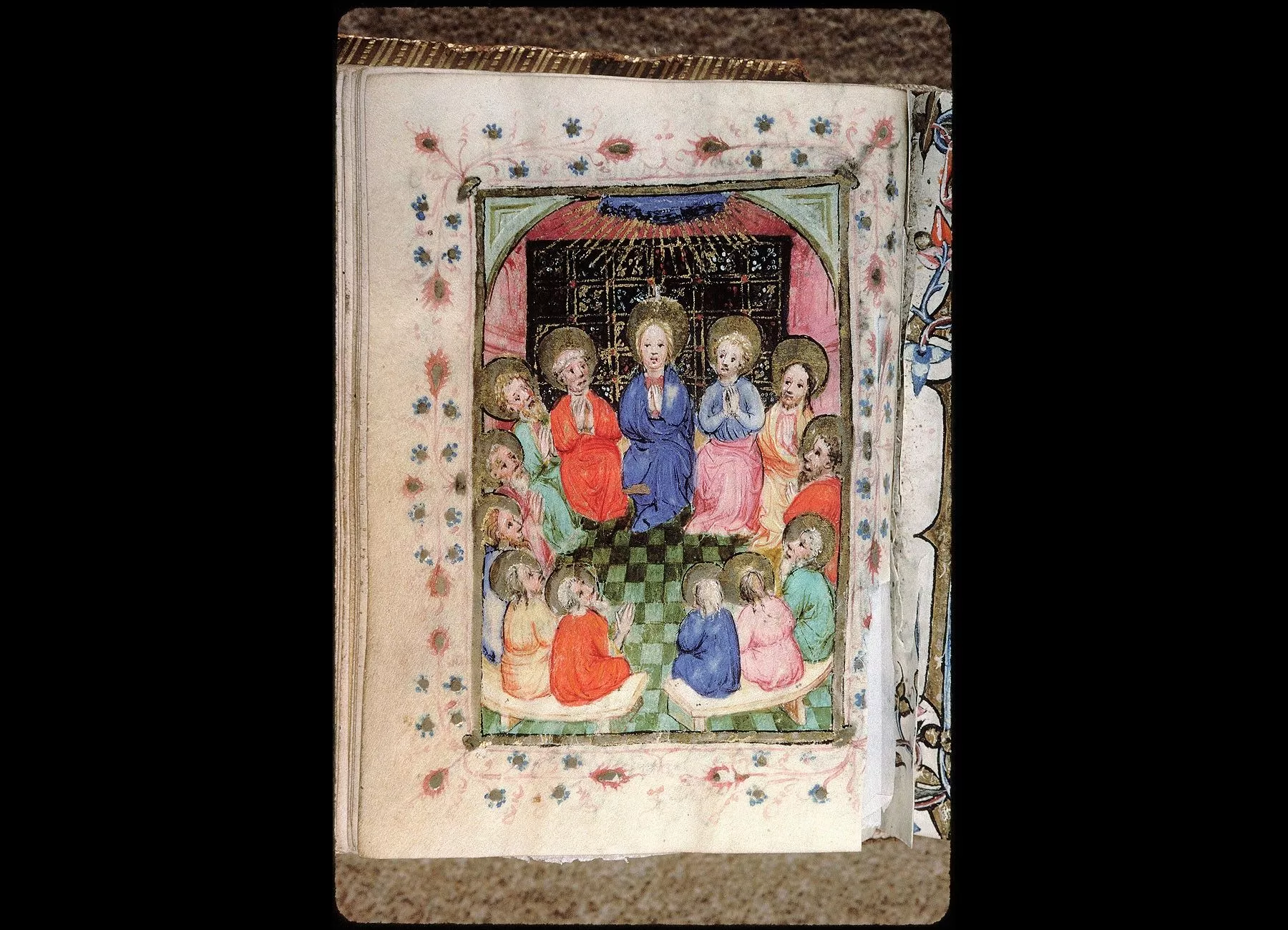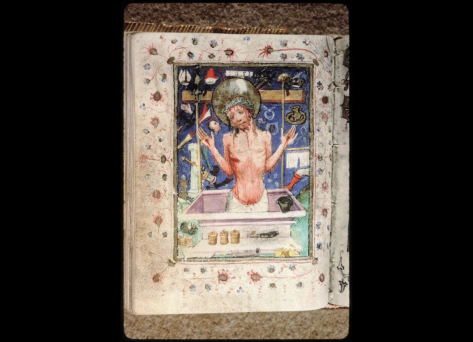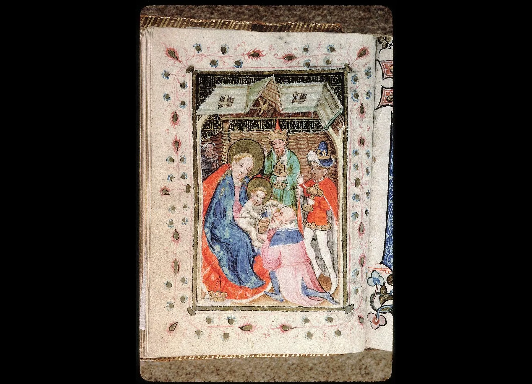 Commentaires de Labande. Commencement du XVe siècle. Vélin. 260 feuillets. 114 sur 78 millim. Miniatures à pleines pages : fol. 21 v°, la sainte Face; fol. 23 v°, la Nativité; fol. 26 v°, la Circoncision; fol. 27 v°,l'Adoration des mages; fol. 29 v°, la Cène; fol. 31 v°, l'Agonieau jardin des Oliviers; fol. 32 v°, le Baiser de Judas; fol. 33 v°,la Flagellation; fol. 37 v°, le Christ en croix; fol. 40 v°, la Descente de croix; fol. 41 v°, Mater dolorosa; fol. 42 v°, la Mise au tombeau; fol. 43 v°, la Résurrection; fol. 44 v°, le Christ aux limbes; fol. 45 v°, Apparition du Christ à la Madeleine;<br>fol. 46 v°, l'Ascension;<br>fol. 47 v°, la Pentecôte;<br>fol. 48 v°,le Jugement dernier;<br>fol. 75 v°, Ecce homo; fol. 139 v°, la Trinité; fol. 202 v°, l'Annonciation; fol. 215 v°, la Vierge et l'Enfant; fol. 240 v°, le Couronnement de la Vierge; fol. 249 v°,la Vierge glorifiée et l'Enfant. Au commencement de chaque partie,initiale d'or ou sur fond d'or, avec ornements qui forment l'encadrement de la page. Rel. veau. (Don du chanoine Collet, 1839.)