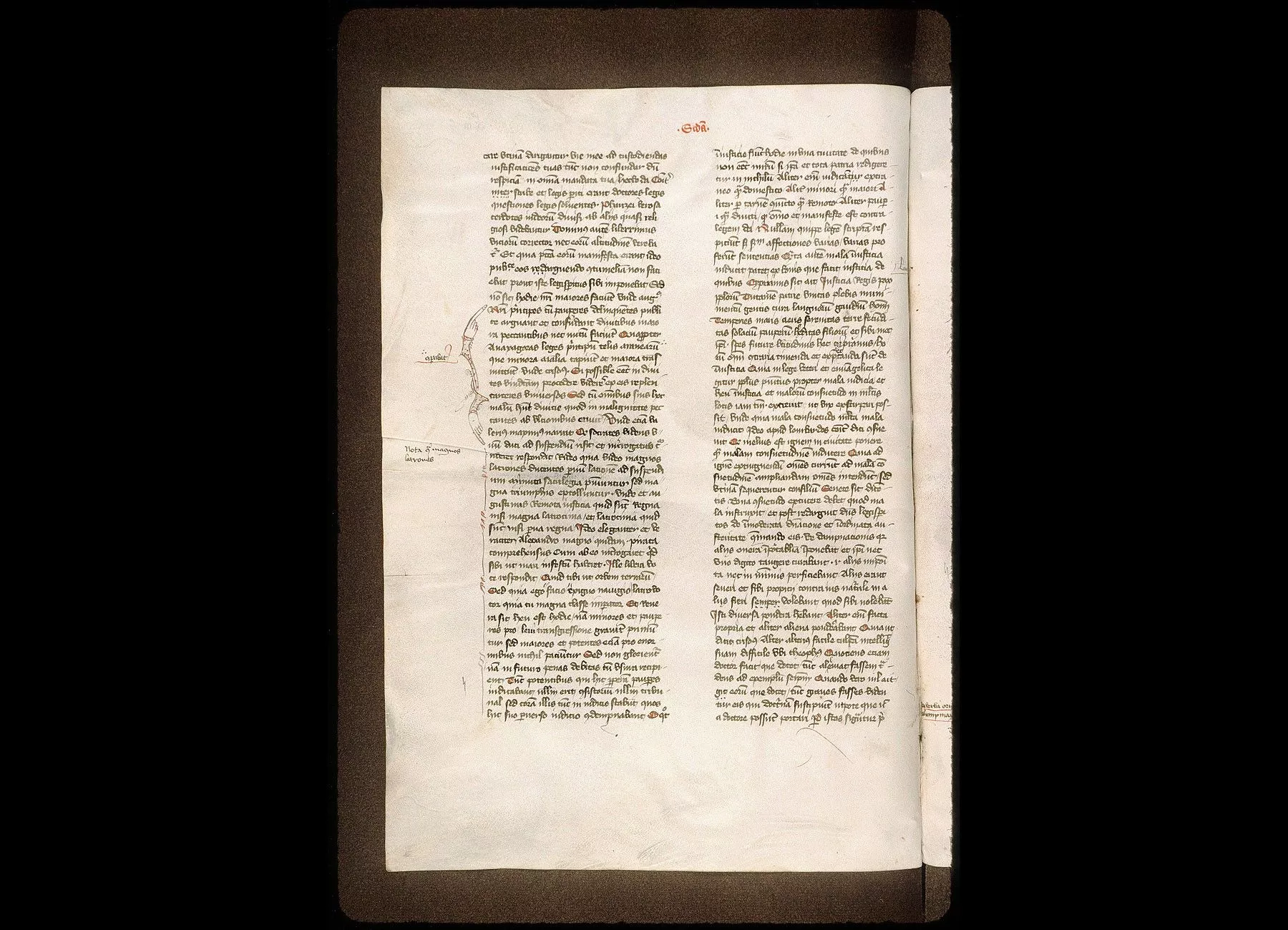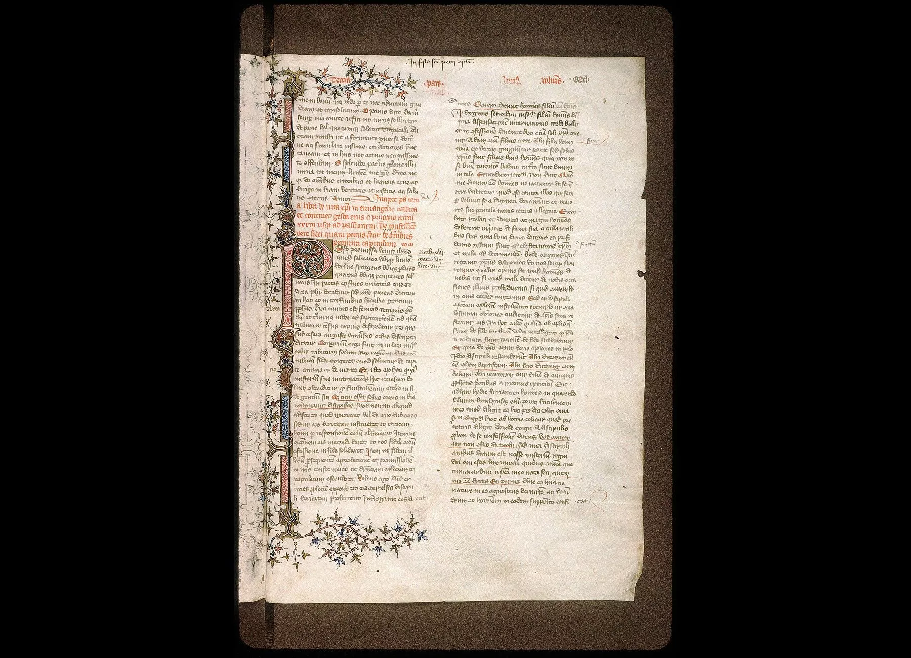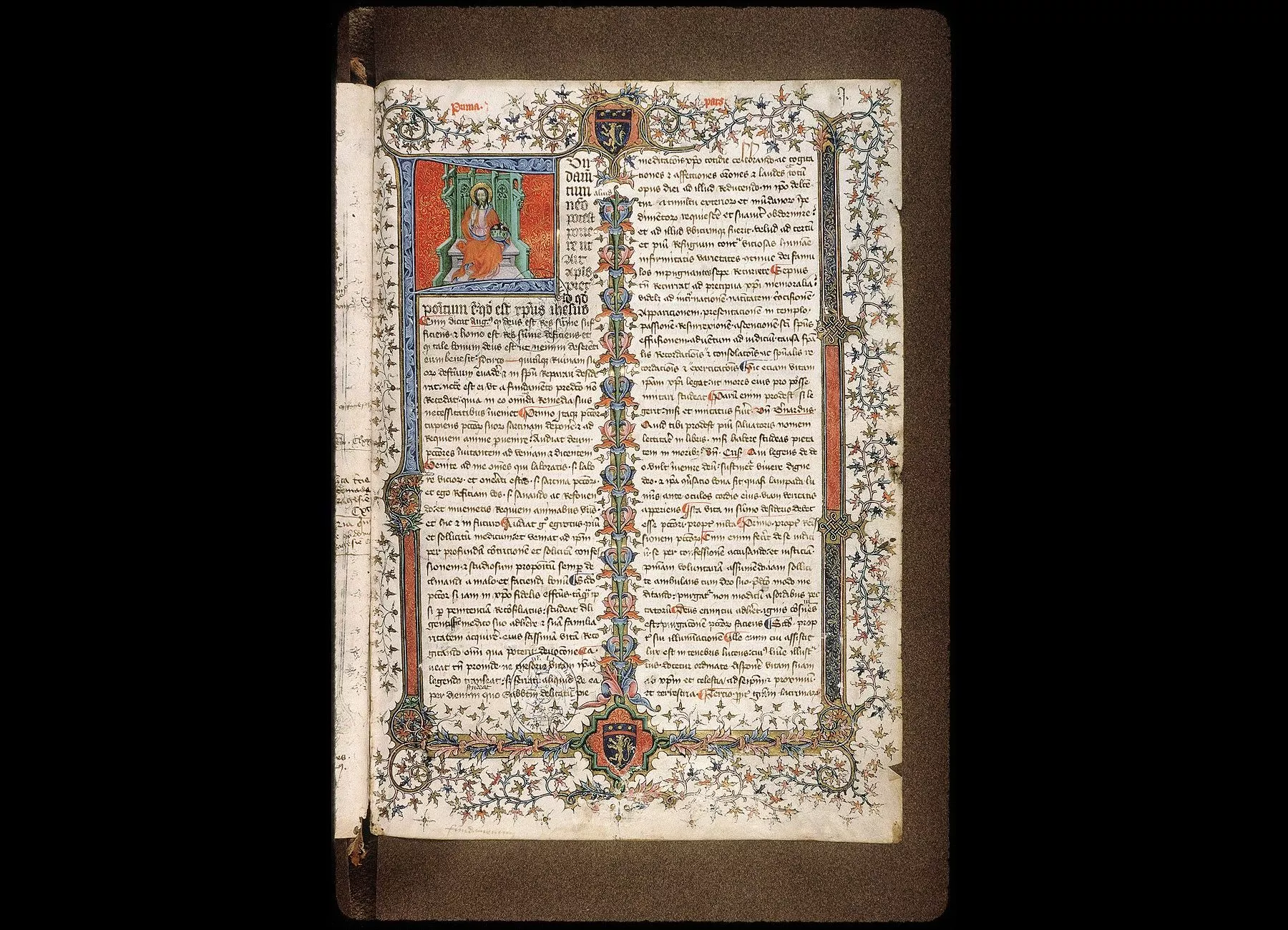 Commentaires de Labande. XVe siècle. Parchemin. Tome I : feuillets A et 1-240 à 2 col.-408 sur 291 millim.- le fol. 1 décoré d'une miniature de style franco-italien, représentant, dans l'initiale, le Christ bénissant, les marges couvertes d'ornements- au sommet et au bas du folio, armoiries portant : d'azur, au lion d'or, armé de sable; au chef d'azur, chargé d'une fasce de gueules et de trois besants d'or; au fol. 5 v°, grande décoration en miniature de style franchement italien- aux fol. 167 et240, décoration au contraire de style français.