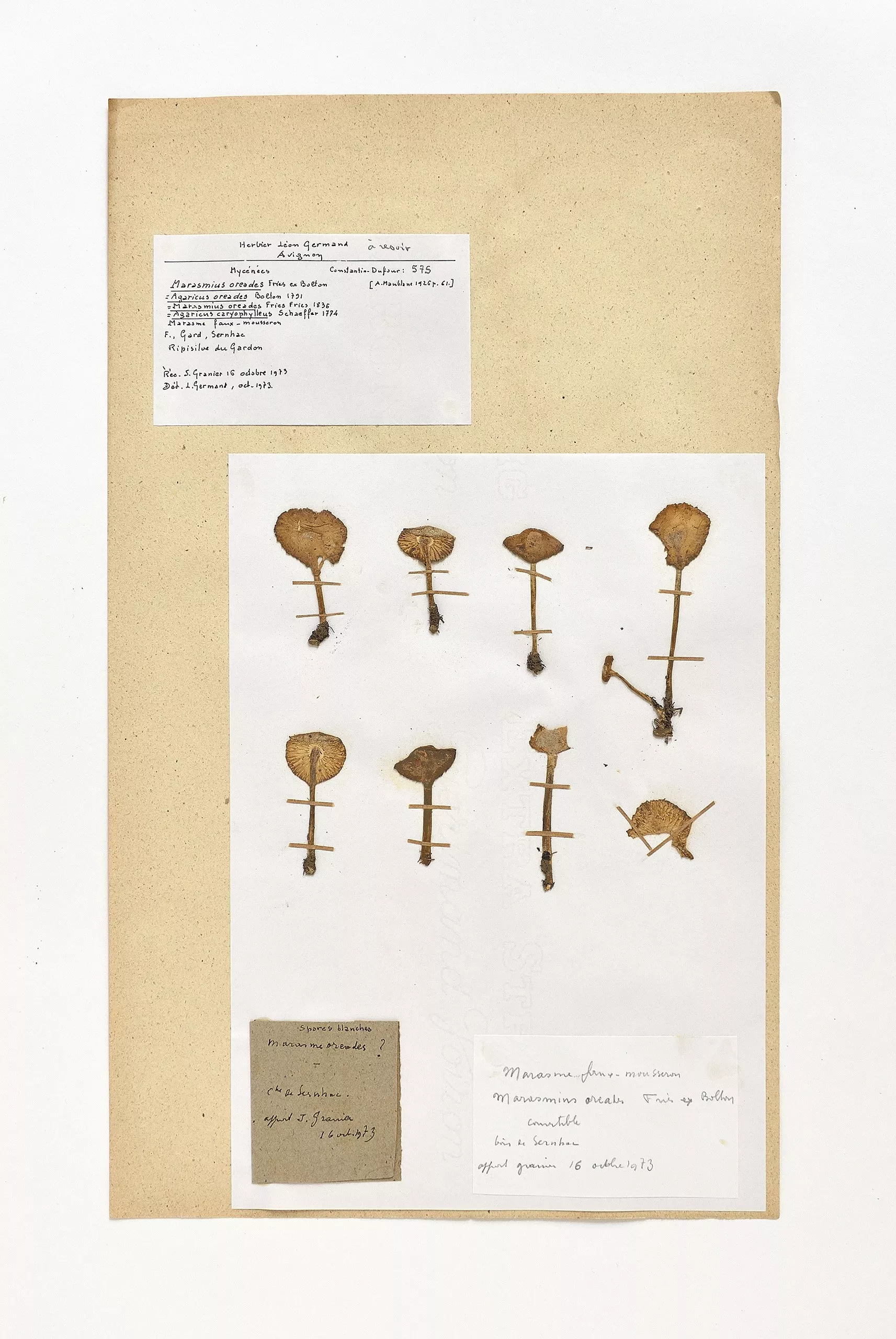 Le marasme des Oréades, appelé aussi "faux mousseron" ou "cariolette", est un champignon originellement dédié aux Oréades, les nymphes des montagnes. Entre le printemps et l'automne poussent ces champignons, en ronds de sorcière touffus, montrant individuellement un chapeau roux pâle ou brunâtre de 2 à 6cm, un pied creux de 4 à 10cm plus pâle et une chair qui résiste très bien à la pourriture. Le champignon dégage une odeur légèrement amère. Ils se développent dans les clairières, prairies, bords de chemin ou pelouses.