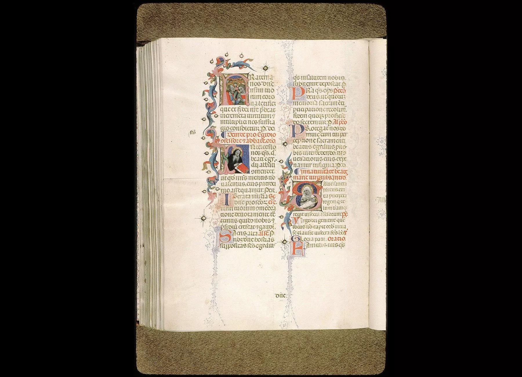 Fol. 346 v°. " Explicit offitium missalis secundum consuetudinem Romane curie. Deo gratias. De sancta Anna. " Suivent des oraisons pour Ste Anne, écrites par une main postérieure