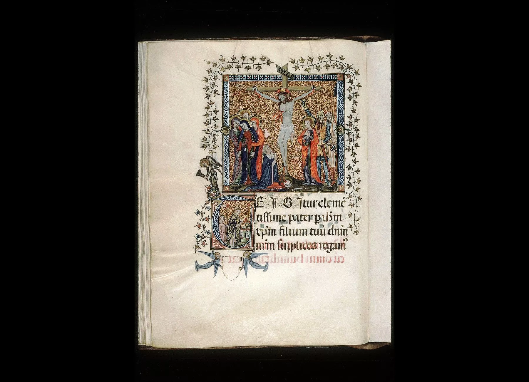 Commentaires de Labande. XIVe siècle. Parchemin. 249 feuillets. 378 sur 261 millim. Initiales ornées, quelques-unes avec dessins au trait- à citer, fol. 1, un faucon et deux cerfs, dont l'un est atteint d'une flèche que lui décoche un chasseur; fol. 20, deux dragons affrontés; fol. 206, le Christ ressuscité. Fol. 133 v°. Au commencement du canon, grande miniature sur fond rouge et or représentant le Christ en croix, avec,d'un côté, la Vierge et trois saintes femmes- de l'autre côté, S. Jean,un soldat romain et un Juif armé d'une lance, et au pied de la croix un cardinal agenouillé; l'initiale miniaturée représente le même cardinal officiant; au bas, deux anges supportant un écusson dont on a gratté les armoiries; marge richement décorée, ange avec sonnette.Rel. bois, recouvert de basane ornée de dessins, avec encoignures,pièce de milieu et fermoirs en cuivre repercé, repoussé et ciselé.