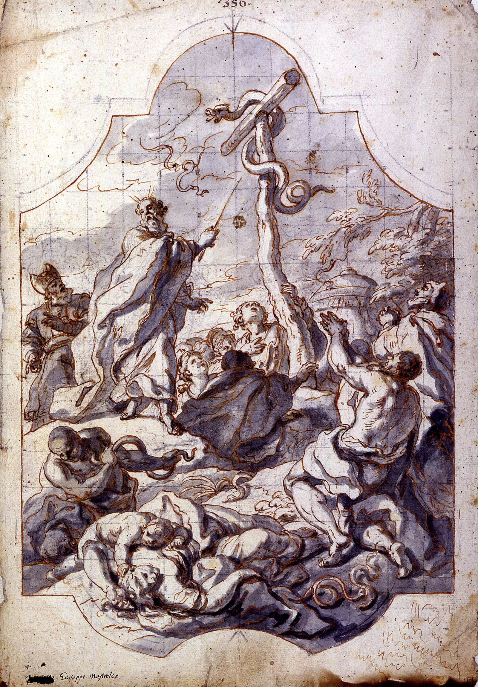 En bas à gauche, plume, encre brune : « Farelli » (cancellé), « Guiseppe Mastroleo » ; en haut au centre, encre grise,plume : 356