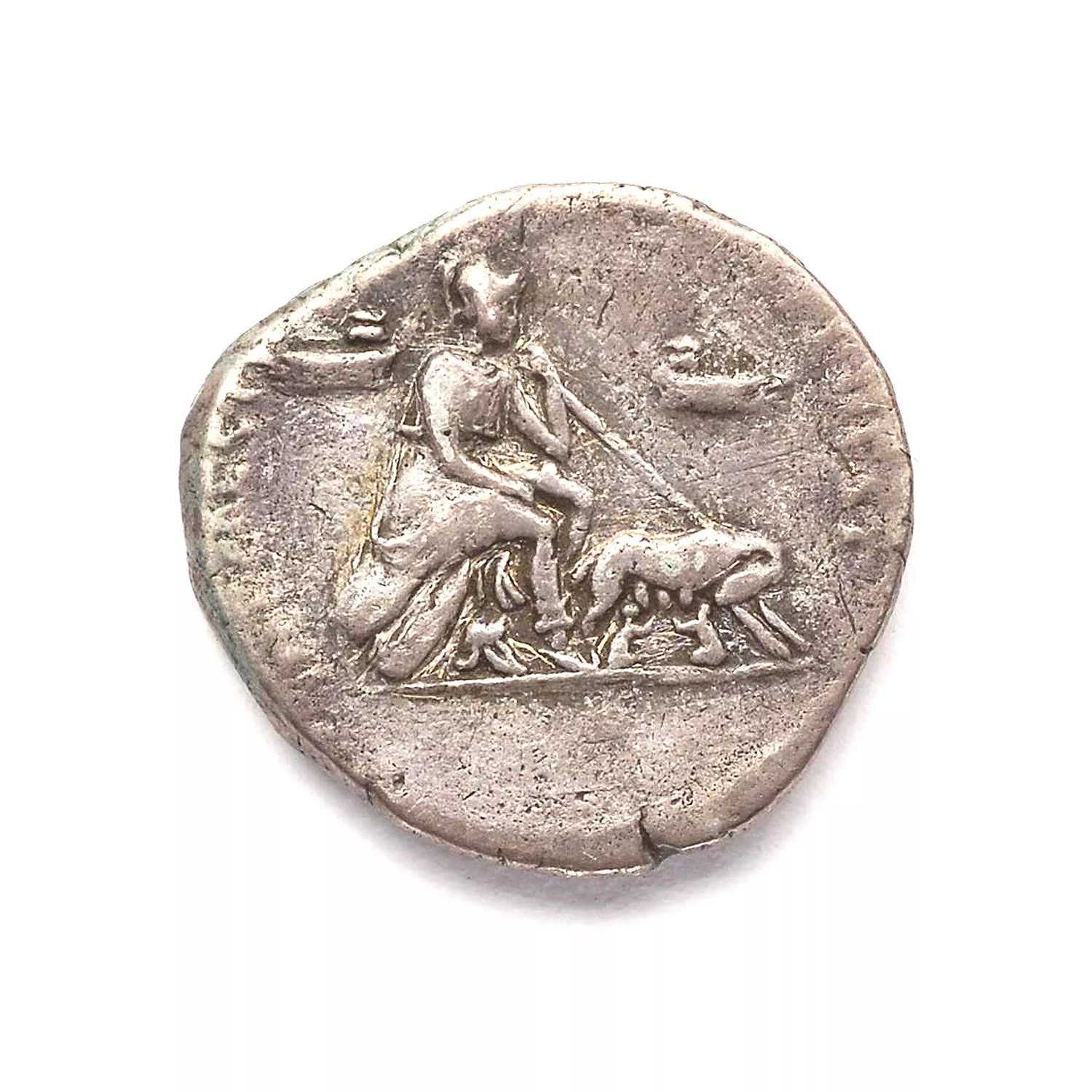 Rome assise à droite sur une pile de boucliers, tenant une lance ; à ses pieds, un casque ; devant, louve à droite allaitant Romulus et Rémus ; de chaque côté, un bateau ?