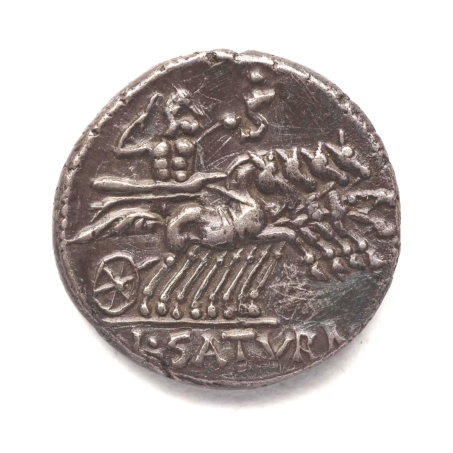 Saturne dans un quadrige à droite, tenant les rênes et l'harpa ; au-dessus, ./S
