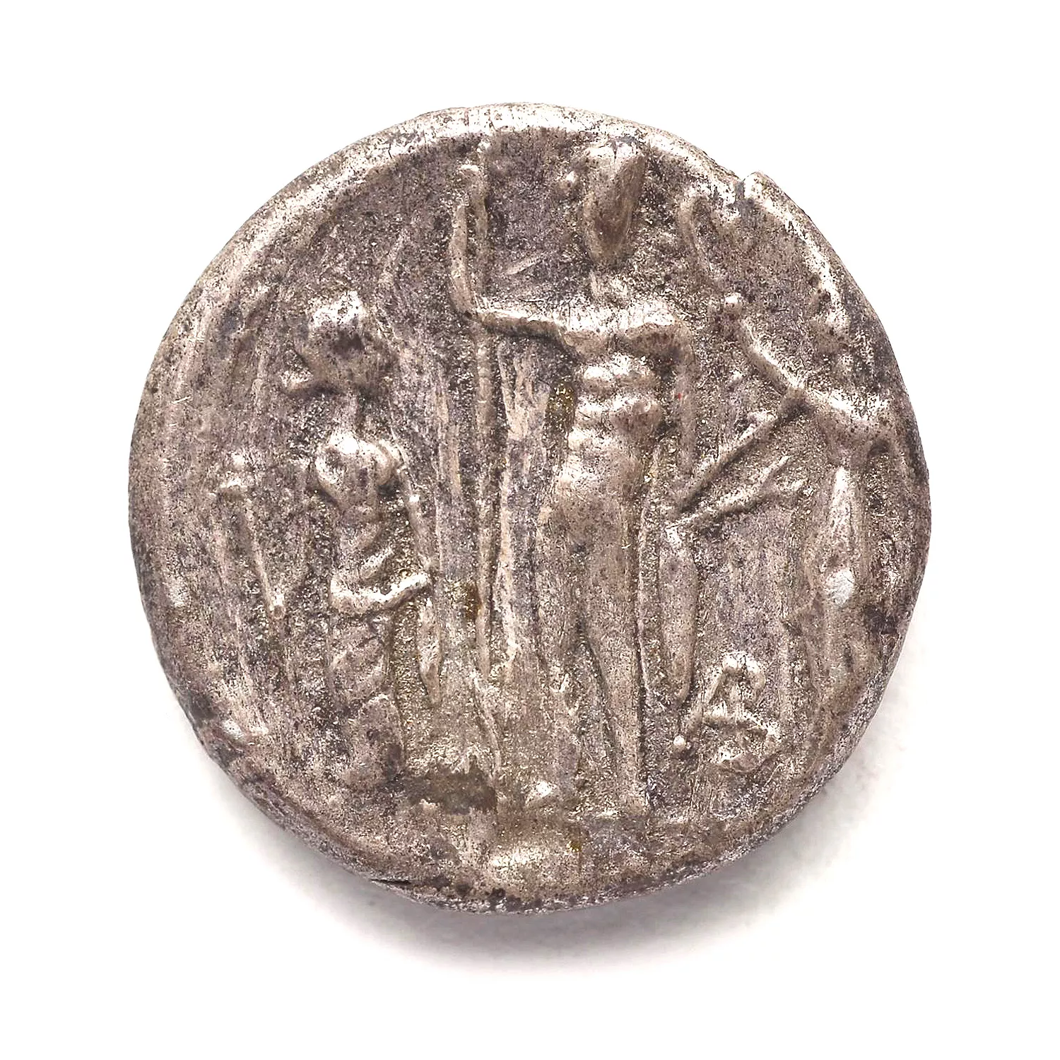 Jupiter debout de face, tenant un sceptre et un foudre, entre Junon et Minerve, cette dernière le couronnant