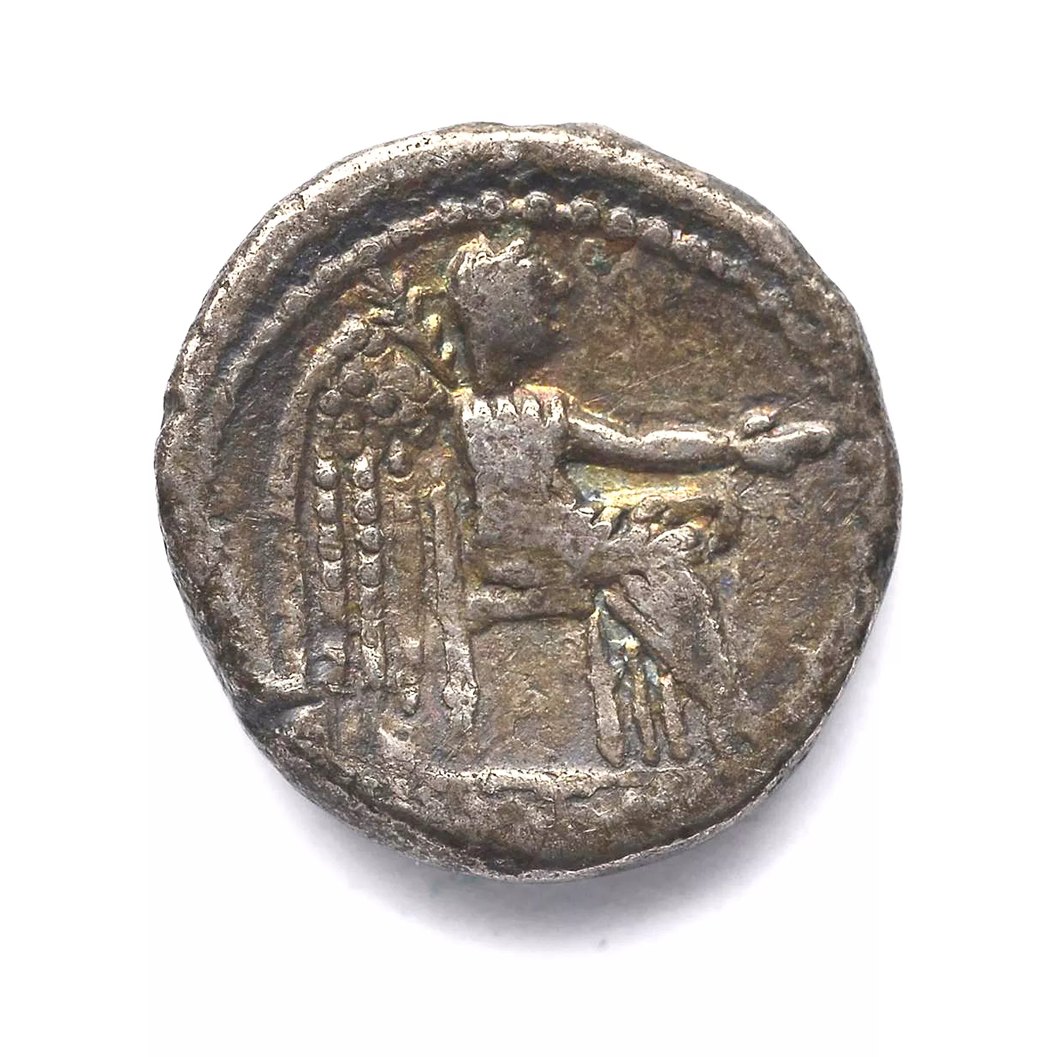 Victoire assise à droite, tenant une patère et une palme