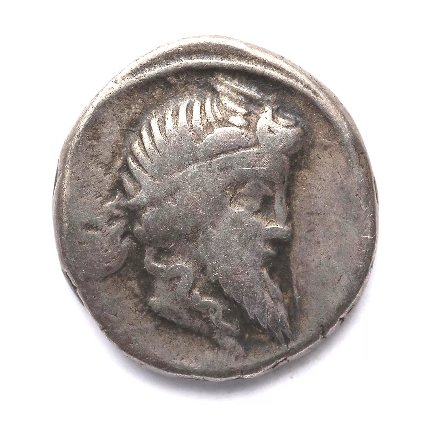 Tête barbue, portant un diadème ailé, à droite