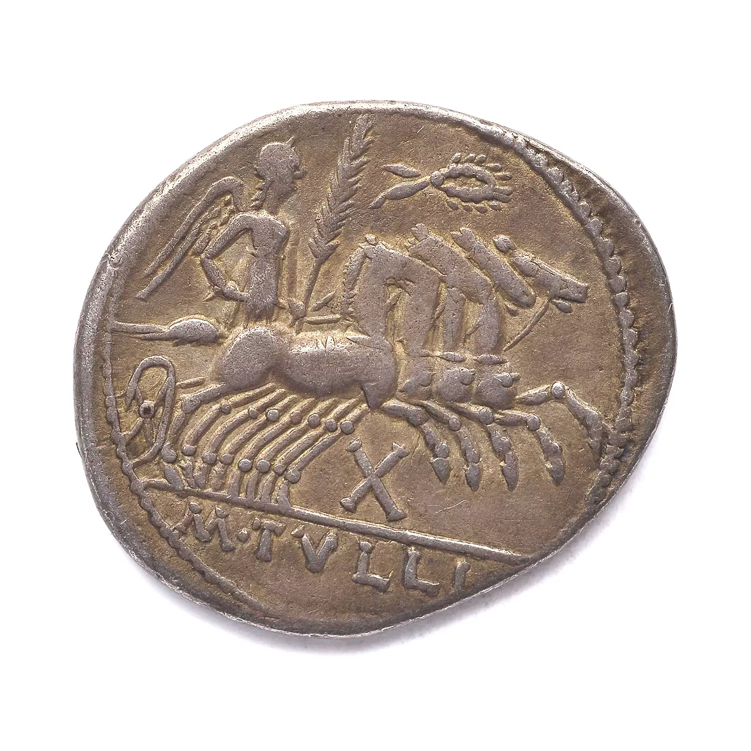 Victoire dans un quadrige à droite, tenant les rênes et une palme ; au-dessus, couronne