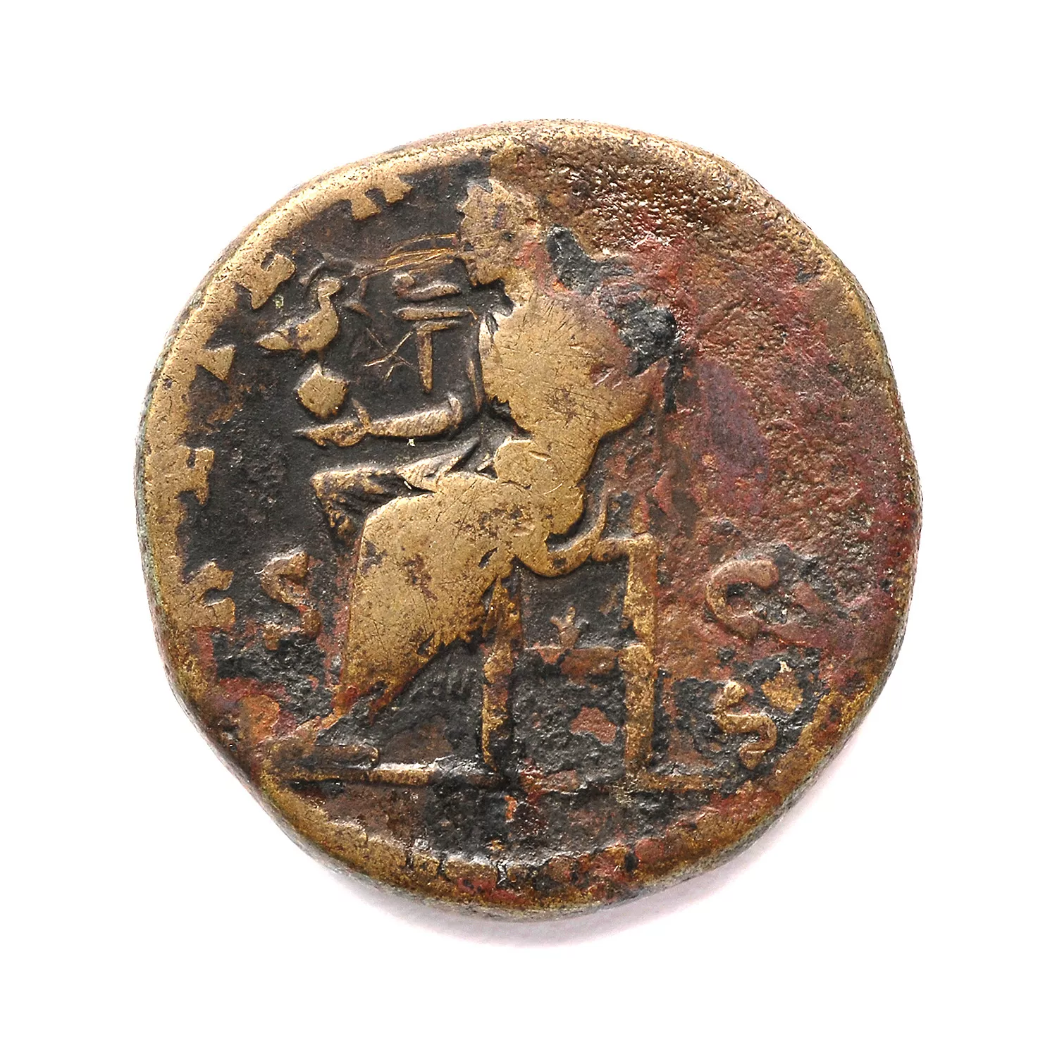 Aeternitas, voilée, assise à gauche, tenant un globe surmonté par un phoenix et un sceptre