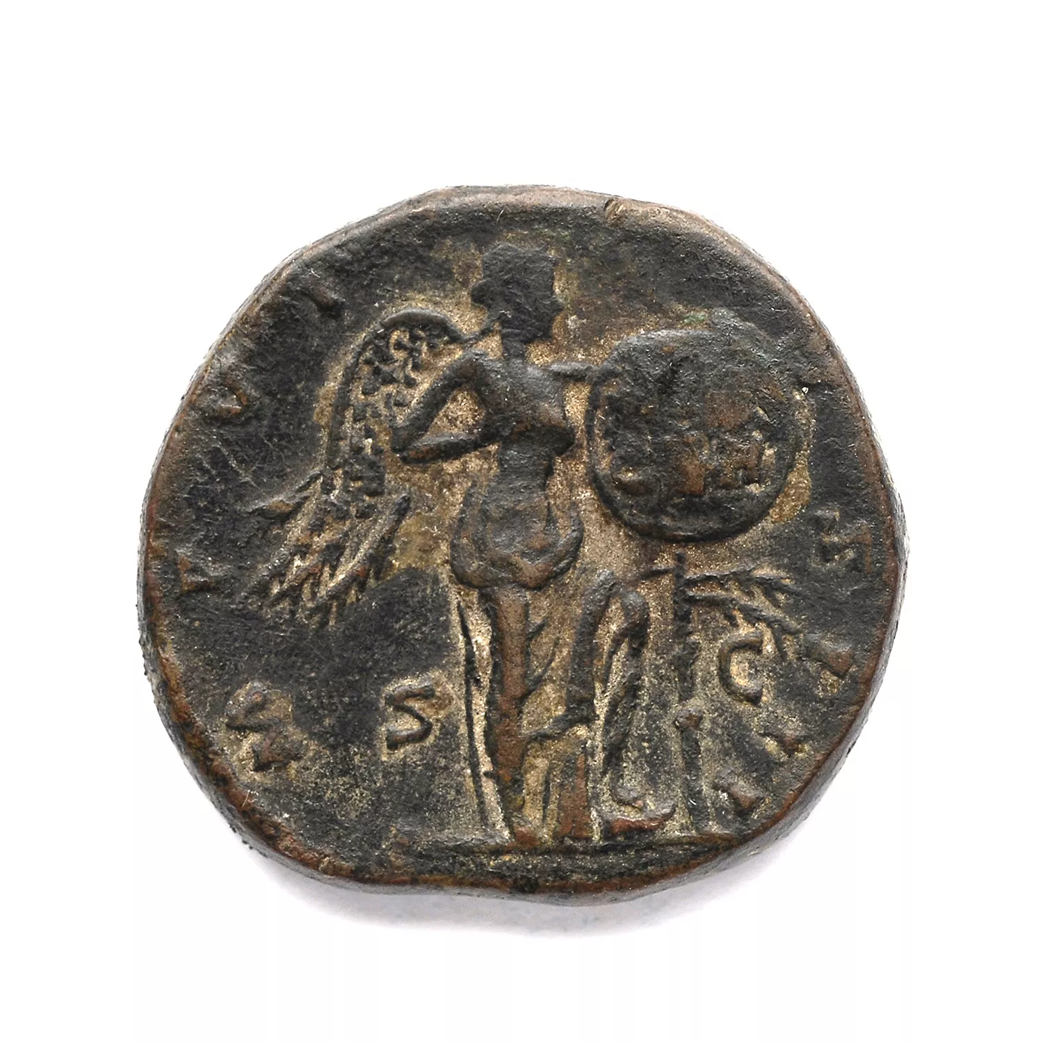 Victoire debout à droite fixant sur un palmier un bouclier portant l'inscription VIC/GER