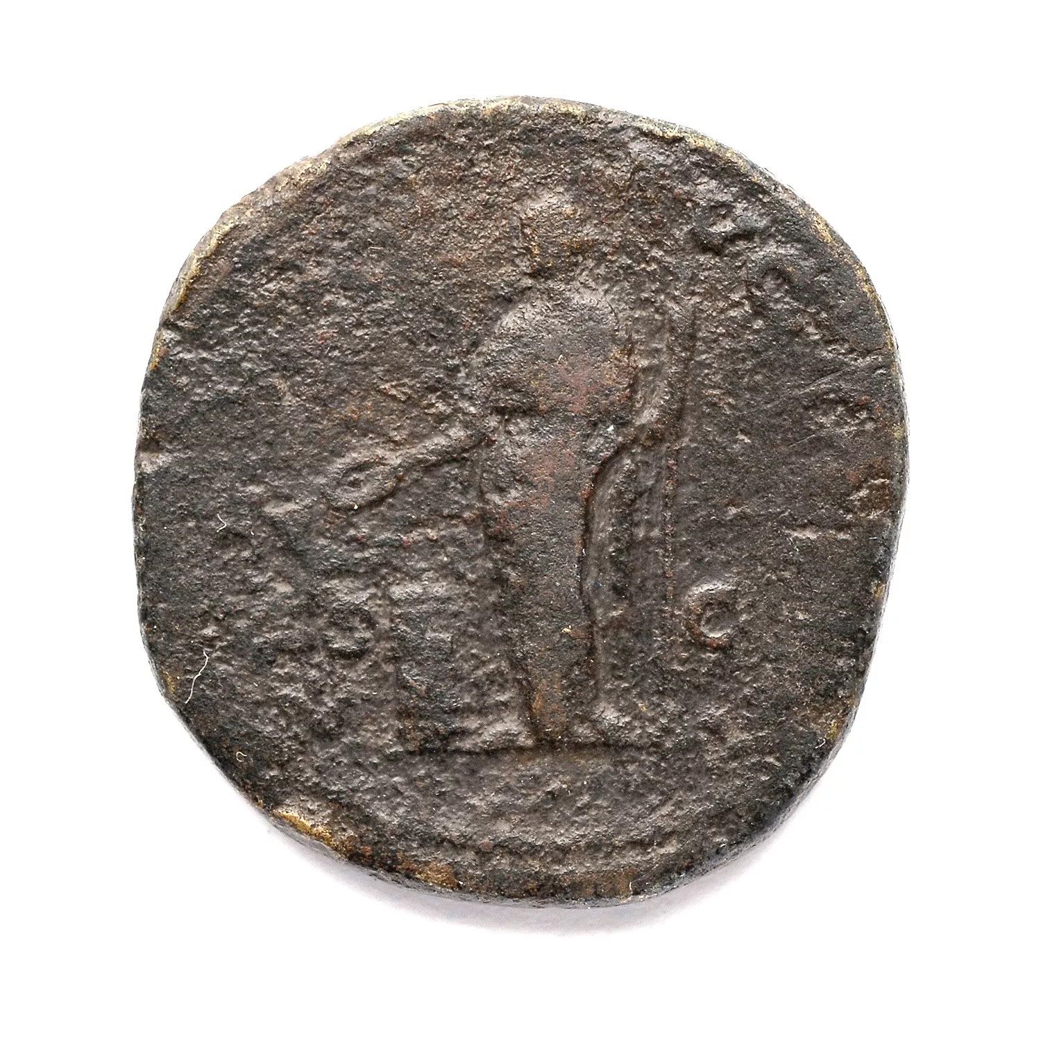 Salus debout à gauche, nourissant un serpent enroulé autour d'un autel et tenant un sceptre