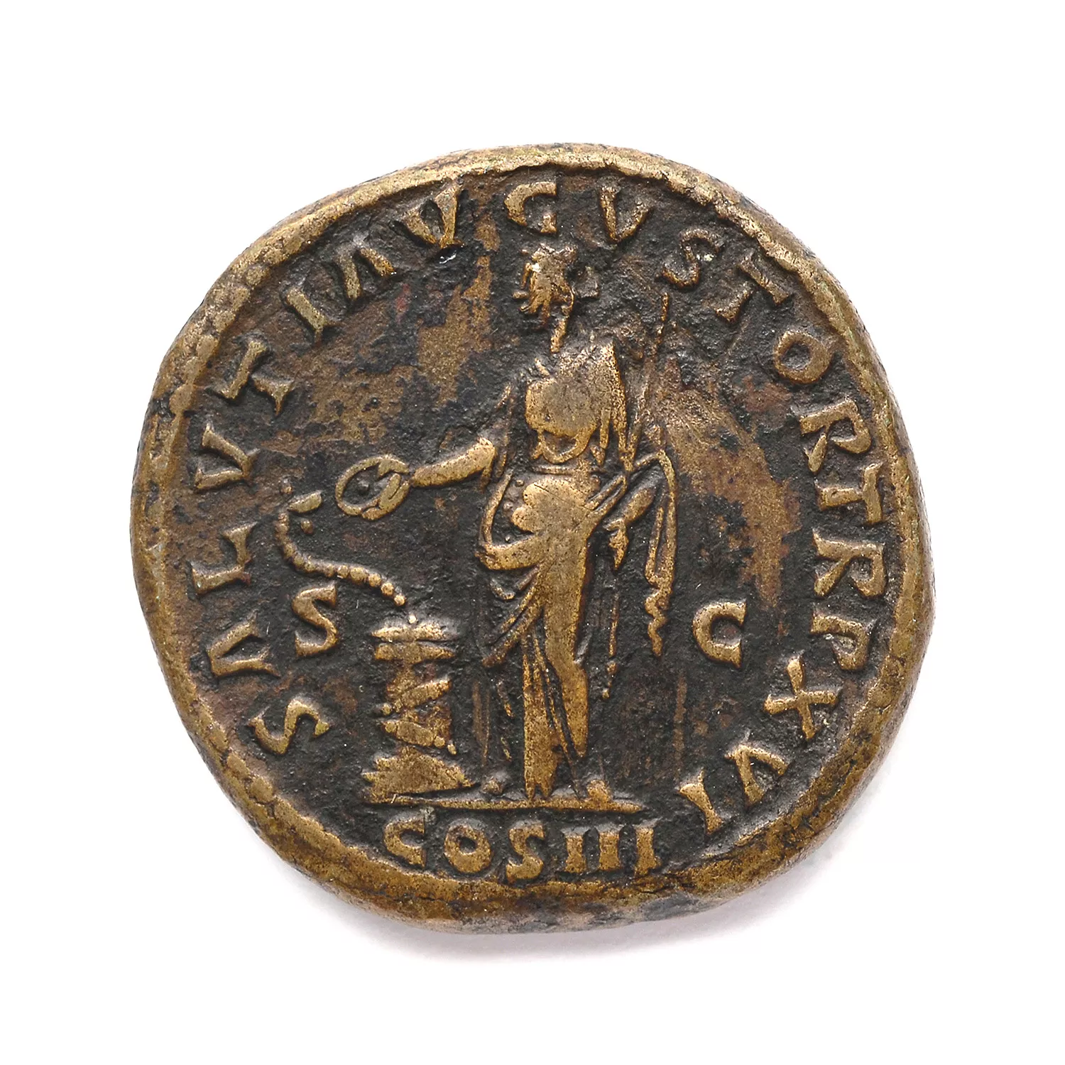 Salus debout à gauche, nourrissant un serpent enroulé autour d'un autel et tenant un sceptre