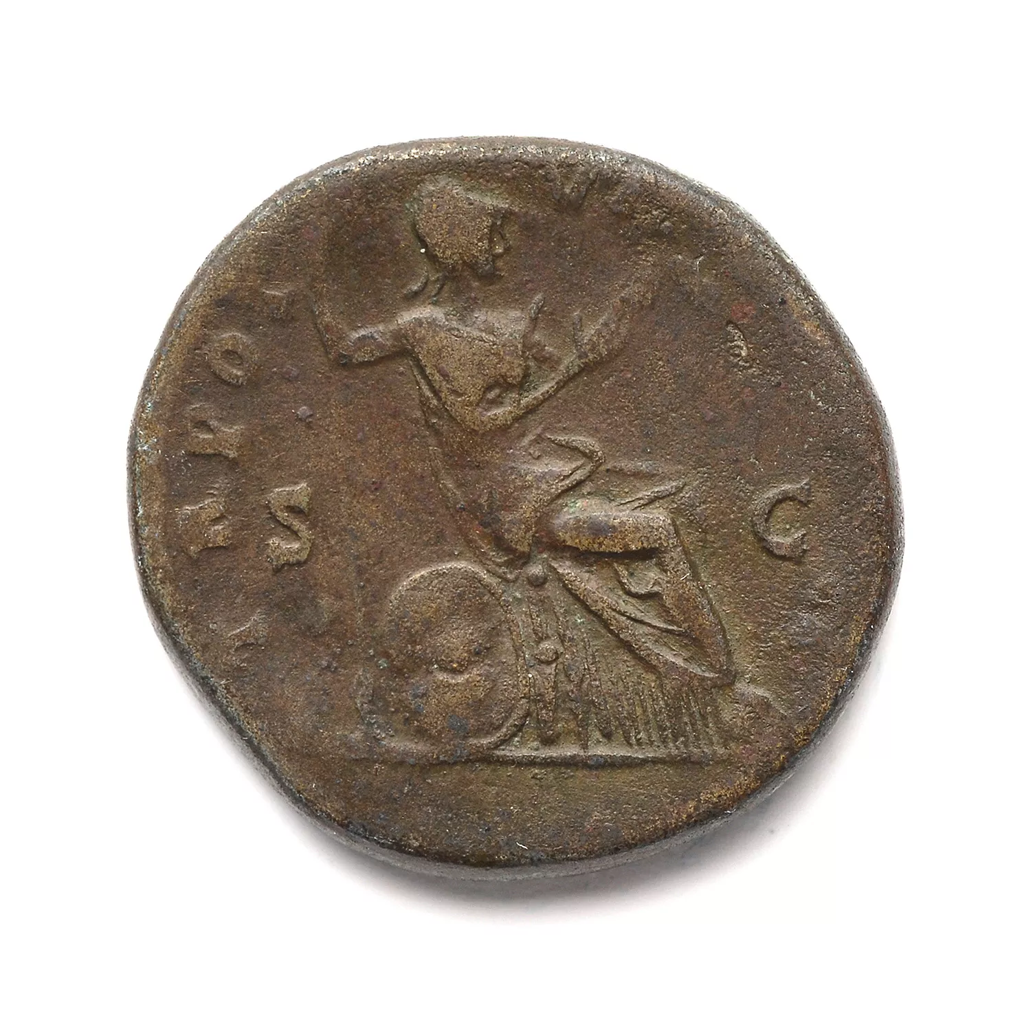 Minerve assise à droite, tenant une lance et présentant l'aegis