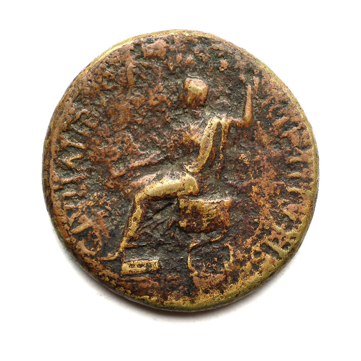 Tibère assis à gauche, tenant une patère et un sceptre