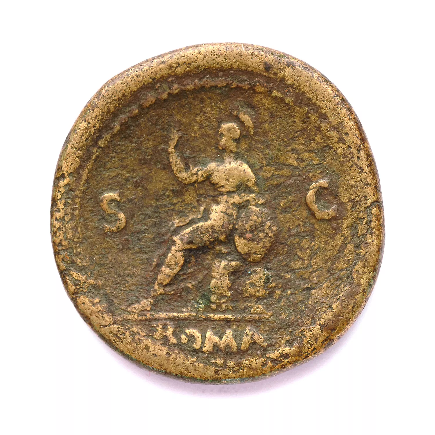 Roma assise à gauche sur une cuirasse, tenant le parazonium et une lance