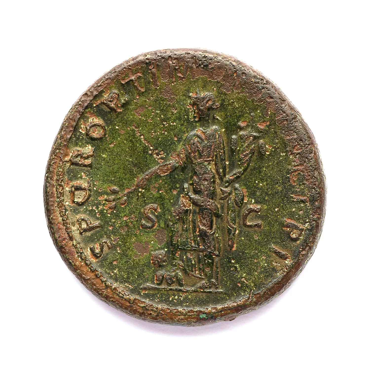 Pax debout à gauche, tenant un rameau et une corne d'abondance, son pied sur un captif dace